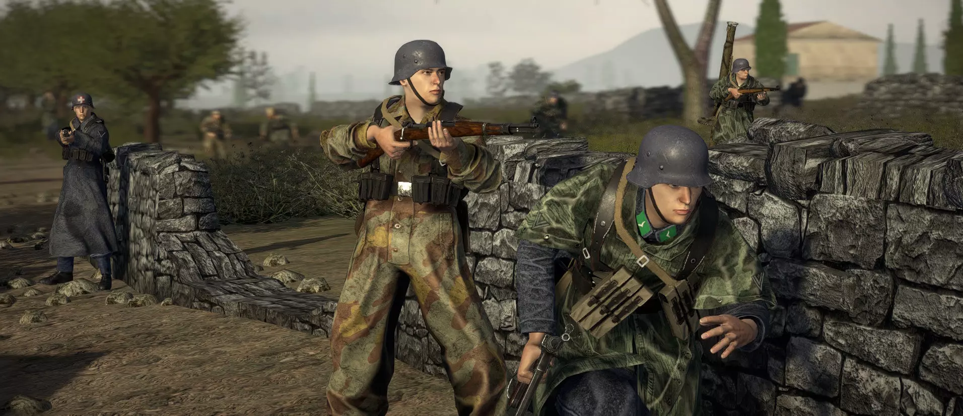 但坦克本身只是故事的一部分。所有德国载具现在都配备了全新的动态迷彩系统,该系统支持多种符合历史的迷彩图案。对于任务创作者而言,这一系统带来了革命性的变化:迷彩可以根据地区(纬度/经度)、时间段(月份和年份)以及季节性天气(如降雪)自动适应环境。 这意味着载具会自然呈现出1941年北非沙漠或1944年冬季东线战场应有的外观,无需任何额外设置。当然,如果创作者希望完全掌控,仍可以手动选择特定的迷彩图案。 这种方法不仅增加了数十种新的迷彩变体,还显著提升了每个战场的视觉真实感。我们不会止步于此:在下一次更新中,这套自适应系统将推广到所有剩余载具,确保整个载具体系都能达到这一新的质量标准。 来认识一下德国空军野战师! 在安齐奥战役中,许多被部署的部队都来自德国空军野战师,他们以标志性的蓝色制服和碎片迷彩罩衫而闻名。如今,他们在我们的最新更新中占据了一席之地——安齐奥战役现已加入著名的“赫尔曼·戈林”师。