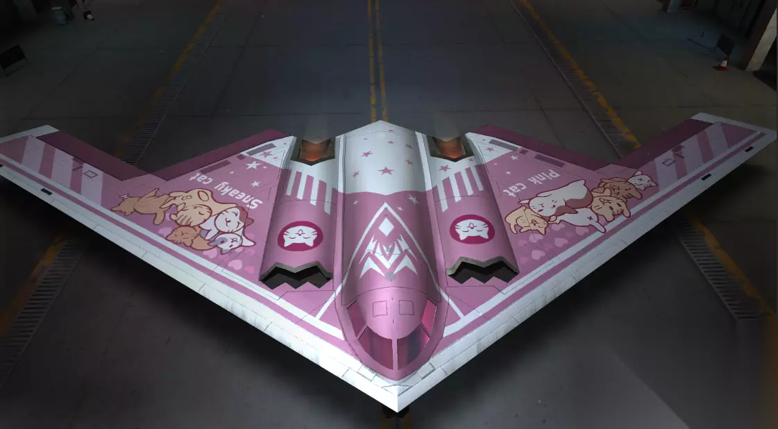 【觅心风暴】是RA-B20 守护神的第二款涂装,涂装以粉色作为底色,在机身的边缘使用了白色镶边,在中央机身两侧隆起的发动机舱上喷绘着猫猫的头像,发动机尾部的白色区域点缀着一些星星,机翼的两侧都喷绘了很多的小猫,小猫们的样子憨态可掬,十分的可爱。该涂装为RA-B20 守护神提供了导弹杀伤力+4的属性,RA-B20守护神作为一架攻击机,在速度方面稍显不足,不过它的攻击攻击范围还是非常不错的,装备该涂装后能够让守护神的攻击力更上一层楼。