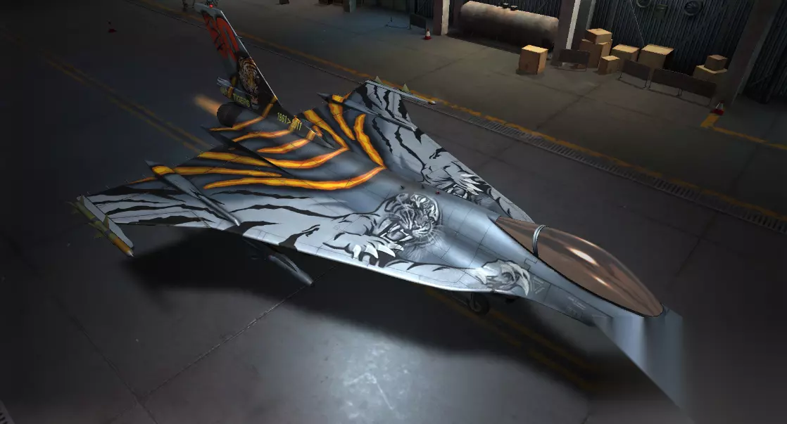 【猛虎】是FA-121X驭风的第二款涂装,涂装的整体颜色为银色,飞机的尾部用橘黄色勾勒出老虎的花纹。在飞机的三角机翼的两侧分别喷绘了一头老虎,它的头又大又圆,嘴巴里长着两排锋利的牙齿,庞大的身子,脚上还有锋利的爪子,皮上的花纹非常美丽,眼睛里射出威严的目光,真是又可怕又威风,虎被称为百兽之王,它是胜利和力量的象征。该涂装为FA-121X 驭风提供了装甲+50的属性,装备改涂装后,驭风的装甲在S级中是数一数二的存在,十分强大。