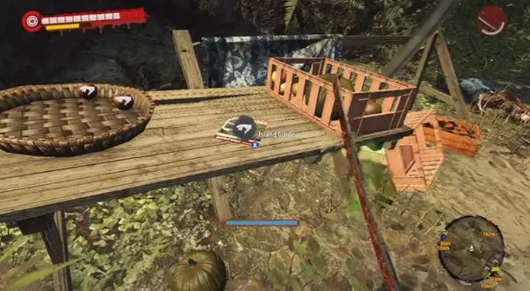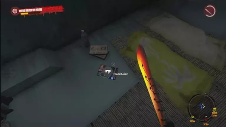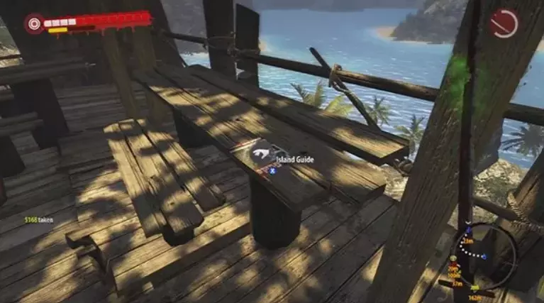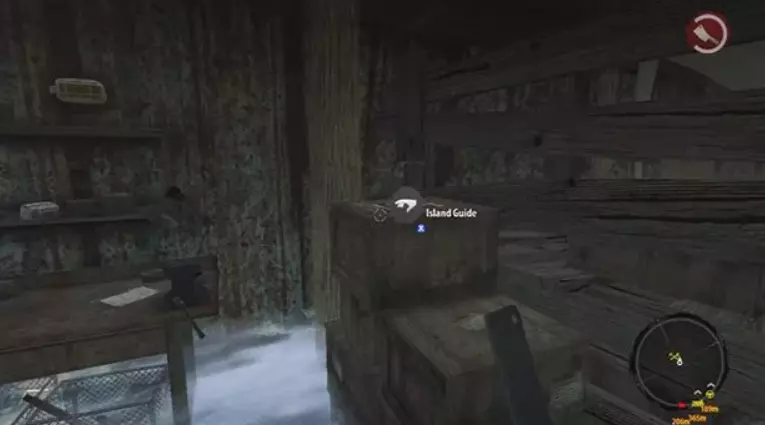 指南手册第8页 在第一个区域的被淹没丛林中,地图上直升机残骸正南方向有三个呈O-O-O阵型的树木平台——该O-O-O结构(以及“Rescue Megan”任务)的东北方向有一个营地,地面上放着这本手册。