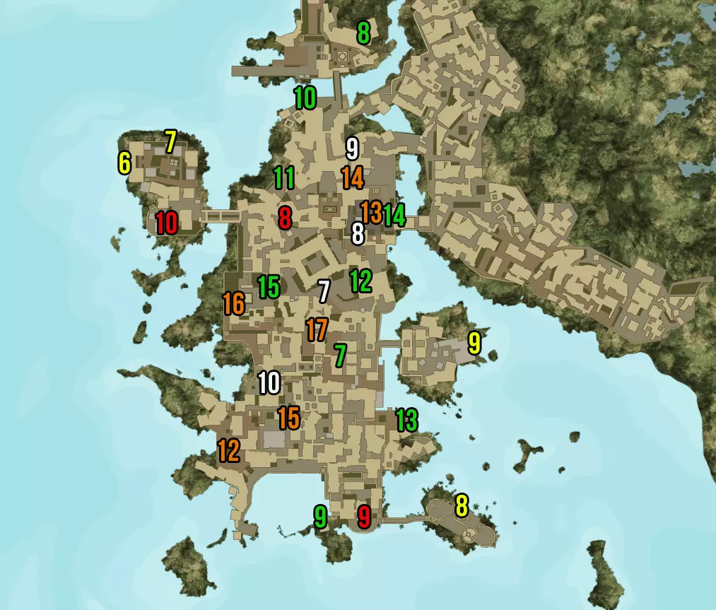 这是我们的地图,可靠的老伙计,在这部分我们要关注绿色数字。那么,让我们来看一下。 淹没丛林明信片1 天堂建筑(可能需要你进入第二章才能解锁建筑大门以进行快速旅行)。
