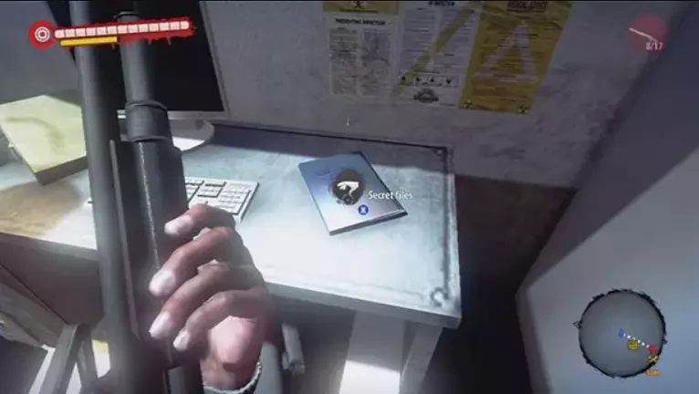 秘密文件7 电影院西边的军事基地。文件位于快速旅行地图旁边,在刷霰弹枪的桌子上。