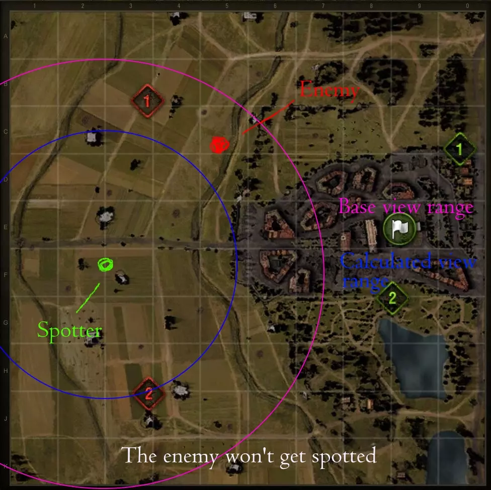 在上方图片中,敌方坦克对侦察方队伍仍处于**未被发现状态**,原因是尽管侦察方的观察点与敌方的被侦察点之间存在清晰的视线,但敌方坦克**不在侦察方的计算视野范围内**。