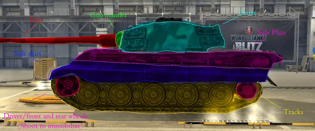 1. **虎式II型坦克侧面的部分已用不同颜色进行标注和命名,注意其前后车轮与履带其他部分是分离的,射击这些部位时有较大几率对坦克及其履带造成伤害。履带的其他部分则会直接吸收炮弹。** 2. **以下是装甲穿透机制的部分说明:** ① 坦克履带有可能吸收炮弹。 ② AP(穿甲弹)和APCR(硬芯穿甲弹)若以小角度命中敌方坦克,很可能发生跳弹。 ③ HE(高爆弹)和HEAT(破甲弹)永远不会跳弹。 ④ 炮弹的穿深会随距离增加而下降(HEAT除外)。 3. **许多装甲优良的坦克通常都有被称为“弱点”的部位,这些部位容易被击穿。常见的弱点可能包括坦克的首下装甲、侧面和/或后部装甲以及指挥塔。**1. **坦克的侧面和后部装甲通常远弱于正面**。此外,部分坦克还拥有其专属的弱点。 2. **若无法击穿常规的首下装甲或指挥塔,且无法攻击到其侧面或后部时**,通常的弱点为非倾斜装甲区域,或是倾斜角度最小的装甲板。 3. **一般而言,瞄准倾斜角度在70-110度之间的装甲板是个不错的选择,角度越接近90度越好**。 4. **如果即使使用金币弹也完全无法击穿敌方装甲**: ① 寻找其他装甲更弱的目标。 ② 尝试使用高爆弹(HE)对坦克进行溅射,造成少量伤害以协助团队。 ③ 在这种情况下,切勿强行攻击敌人,应等待队友支援。