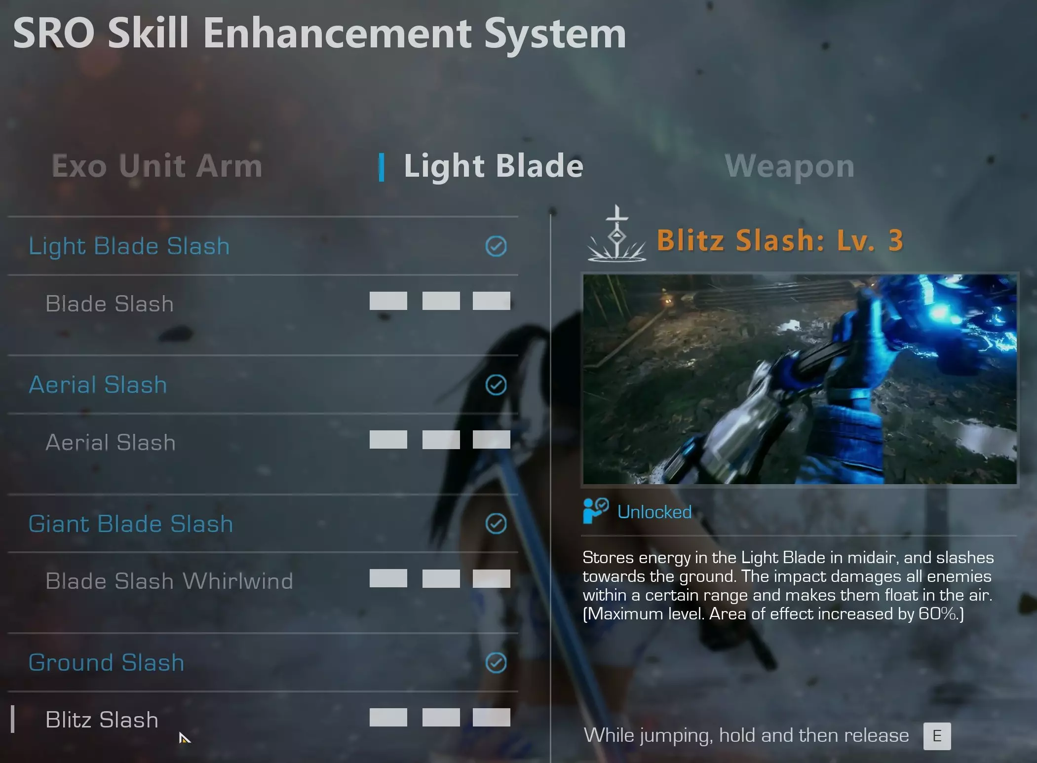 只有少数战斗无法使用它。例如最终 boss、对抗狙击手的战斗或禁止区域的敌人,但在所有允许一定程度近距离战斗且不会立即死亡的敌人(群体)上,你都可以使用它。 此故障已在 PC 版上成功测试,至于是否能在主机版上运行,我无法亲自确认。如果你能在主机版上使用它,请告诉我,我会将此内容添加到指南中。 基础操作 地面斩击是一种轻刃技能,使用前必须先解锁。请尽快解锁。在我看来,轻刃通常是游戏中最有价值的武器。我主要使用它,次要武器则首选霰弹枪和狙击枪。
