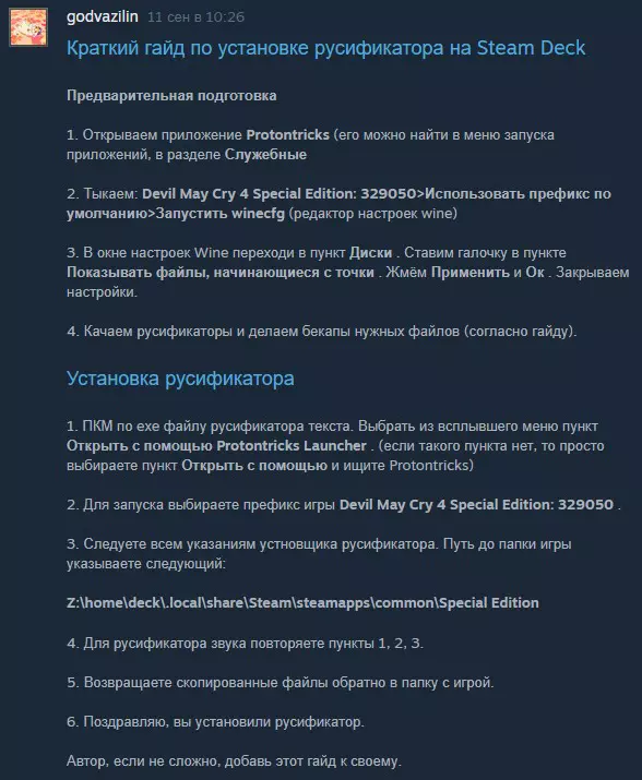 在本指南的评论中,也有人分享了在Steam Deck上安装俄语化补丁的完整分步说明。