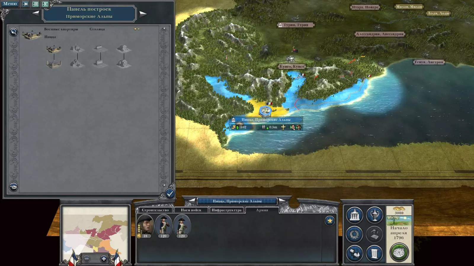 那么,我们来分析一下战役。 您的舰队的主要功能包括: 保护贸易路线; 封锁港口; 运输部队; 与敌方舰队作战。 现在谈谈运用策略。 如果您在海上拥有优势(法国和英国),那么最好是封锁港口并消灭单独的舰队。 如果您的舰队并非最精锐,那么最好是攻击单独的部队和贸易路线。组建什么样的舰队最好。我强烈建议使用经典舰船:护卫舰和战列舰,因为前者是最平衡的舰船,而后者是真正的海上堡垒。各种双桅横帆船、装甲舰、蒸汽船最好不要使用。 使用战术。 建议在拥有优势的情况下使用结果计算(海战是游戏中最枯燥且最复杂的部分)。如果您决定战斗,那么请注意风向,及时调整船舷方向,使用舷炮齐射和接舷战。 战役示例:拿破仑的意大利战役。我们拥有一支主要由初始部队组成的常规军队。在战役后期,可以招募轻步兵和8磅炮。敌人的实力并不强大。在任何难度下都比较容易游玩。这场战役的关键在于外交、快速攻城以及完成额外任务。