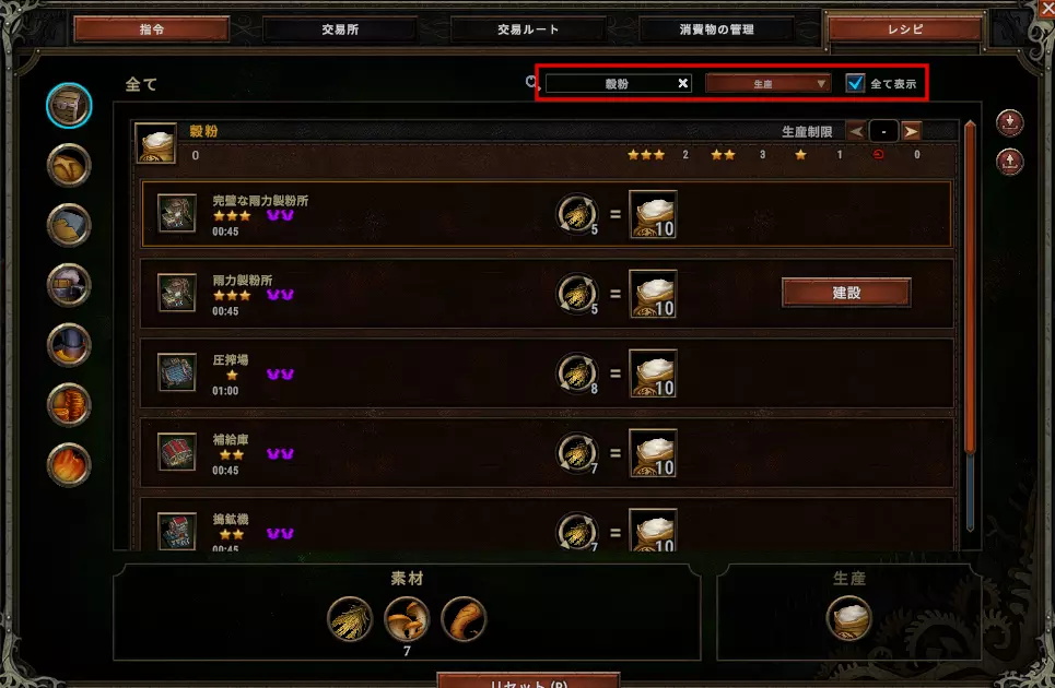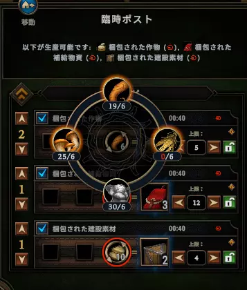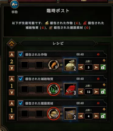 设定左图中的上限值后,即可设定产物的上限数量。这样一来,系统会维持生产数量不低于设定值。以左图中的打包作物为例,若从0个开始生产,会持续生产直到数量达到5个以上,也就是进行3次生产(3次×2个=6个)。之后,只要仓库中数量保持在5个以上,就不会继续生产;当库存降至4个以下时,生产会再次启动。 如果未设定此上限,只要素材充足,生产就会无限循环。因此,个人建议对所有产物都务必设置上限。如果不太清楚的话,暂时设定在50左右,应该暂时不会有过大偏差。 可以为生产物设置优先级。 在上图中,每个配方的左侧都有可以设置数字的地方,这就是生产的优先级。通过设置优先级,可以控制生产顺序。图中打包作物的优先级为2,其他为1。在这种情况下,会优先生产打包作物,直到生产出上限数量的5个,或者素材耗尽为止。在此期间,另外两种生产物不会进行生产。 只有当打包作物生产到5个,或者素材耗尽时,才会开始生产下方的两种物品。由于这两项的优先级相同,所以每个工人会随机选择其中一项进行生产。如果已打包的作物数量不足4个,那么将再次以最高优先级生产打包作物。 优先级在需要确保紧急所需物品的情况下非常有用。需要注意的是,在设置优先级时,必须设定上限。如果没有上限,系统将会一直只生产优先级高的物品,而完全不会生产其他产品。 此外,还可以设置不生产那些不想生产的物品。想必很多玩家都已经知道,取消勾选配方旁的对勾后,该产物就不会再被生产了。容易被忽略的一点是,农场和营地也可以取消勾选。例如,小型农场可以生产谷物和蔬菜,取消勾选谷物后,就可以只生产蔬菜了。虽然不常用,但记住这一点总没错。 很多建筑是可以移动的。 虽然容易被忽略,但建筑确实可以移动。