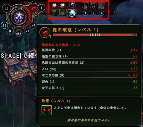 雨季に有益な効果が、嵐に有害な効果が発生する。有害な効果は発動する敵意レベルが決まっている。そのため、敵意レベルが上がってくる中盤~後半にかけて嵐がより厳しいものになってくる。有害な効果は回避条件が設定されている場合がある。例えば、住居の欲求が満たされている、とあれば住居のない住民にだけ有害な効果が発生する。 敵意について敵意は先ほどの画像を見てわかる通り、7つの要素によって増減する。 たとえば、空き地を開けるごとに敵意が増加する。そのため、やみくもに空き地を開けまくるのは効果的ではない。また、人口も敵意増加要因のため、人員が余るようになってきたら、年初めの住民追加は無視するのも手である。 敵意増加の中で特筆すべきは木こりの数である。これは木こりのキャンプに割り当てられている人員の数になる。嵐期は敵意が増加しやすく、種族の士気がマイナスになりやすい。そういったときに、木こりのキャンプの作業者を解除して乗り切れる場合がある。このテクニックは危険な空き地イベントの作業で士気が下がったり、敵意が上がった時に利用できるので覚えておくとよい。 敵意を下げる要素は多くはない。焚火の数と女王の怒りの進行度だけとなる。このうち女王の怒りは高いほど(ゲームオーバーが近いほど)敵意が下がる。要石には女王の怒りが高いほど種族の士気が上がる、といったものもあり、女王を焦らすプレイも面白いかもしれない。 食糧はどうすれば・・・? 食糧事情はどの拠点でもついて回る。 このゲームにおいて食料は調理前と調理後の2種類に分けられる。 基本的に食料は調理したほうが数の効率がよく、住民の欲求も満たせる=士気が上がるため、調理を目指すのがよいだろう。 調理物を個人的に分けると、元となる食材から考えて下記3つがあるかと思う。 今回のゲームで採取できそうな食材からいずれかのルートを目指すとよい。 なお、採取できる食材の情報はゲーム中でも「メニュー」をクリックすれば確認できる。 肉ルート(干し肉、串焼き) 穀物ルート(ビスケット、パイ) バランスルート(串焼き、漬物) 肉ルート(干し肉、串焼き) 肉ルートは一番簡単に食料を増やせるルートかと思う。 必要になってくるのが肉と昆虫で、どちらかがあれば干し肉が生産できる。1種類の食材さえあれば、調理できるのが干し肉の強みである。しかも効率がかなり良く、食料を1.6~2.5倍に増やすことができる。 串焼きは、肉・昆虫 x 別食材といった形で作成でき、肉以外にも食料がある場合に採用しやすい。また、干し肉も材料に使えるため、時間はかかるが干し肉→串焼きとすることも可能。ただし、数の効率はほとんど増加しないため、種族の欲求を満たすのが主となる。 欠点は肉や昆虫が採集できないとうまく回らないこと。土地の情報で肉・昆虫が取れなさそうな場合は別の調理を狙ったほうがよい。とはいえ、あるレベルからは施設「牧場」で肉が生産できるため、採集出来なくても何とかなる場合も多い。 穀物ルート(ビスケット、パイ) 穀物ルートは手間と時間がかかるが、非食材の穀物から食料を生産できるルート。 流れとしては(農場)→穀物→穀粉→ビスケット・パイというように工程が多くなっている。また、一応穀粉は根菜やキノコでも製作可能だが、★1での生産だとかなり効率が悪くなり、生で食べさせるのと大差がなくなる。そのため、穀物を使わないなら★3の施設を使うか、串焼きなどの別調理を目指したほうが良い。 利点は、生食糧のみで見ると効率がかなり良いことと穀物が畑で安定的に生産できることだろう。 穀物のみから穀粉を作った場合、食料効率としては2.5~3.3倍ほどになる。 しかし、とにかく工程が多い+必要施設も多いことが欠点。初心者のうちはこのルートは避けてもよいかもしれない。 バランスルート(串焼き、漬物) 肉が生産できなくてどうしようもないときに流れ着くルート。 串焼きはいろいろな食材の組み合わせで生産できるため、まんべんなく食材が集まるときに重宝する。効率は1.25~1.67倍ほどである。 また、漬物は使える食材が多いうえに比較的効率がよく、★1でも1.67倍の生産が可能である。ただし、生産のために陶器や樽などの容れ物が必要になり、これらの生産難度が高い。正直、序盤で漬物を安定生産するのは無理とみてよい。 最後に、スモルダリングシティでのアップデートをすれば、生食材は勝手に食べられないように制限できる。 こちらを使えば、調理に必要な食材を食べられないようにできる。ただし、当然食べられる食材が枯渇すると空腹になってしまうため、注意が必要である。 種族と士気 士気とは各種族ごとに存在する幸福度である。 0以下になると、逃亡する可能性がある。 逆に、一定以上の場合、名声ポイントがじわじわ上昇していく。 士気が上がる要因 住居や食事、サービスの要求を満たす 拠点(焚火)を1段階アップグレードする 種族をえこひいきする 有益な森
