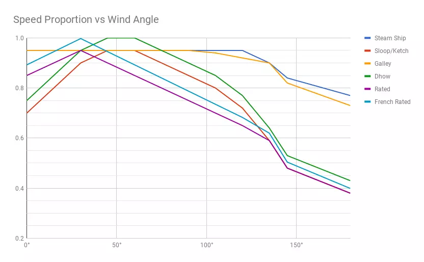 航行性能 游戏中的船只配备多种不同类型的帆,这些帆会影响船只利用风力的效率。下方图表展示了船只在不同迎风角度下的效率。总体而言,大多数船只(评级舰船和双桅横帆船)采用的方帆效率最低,而配备三角帆的船只在各个角度下的捕风效果更佳。图表还显示,桨帆船和蒸汽船在逆风行驶时会有一定程度的减速。值得注意的是,法国舰船的航行性能优于其他所有舰船。