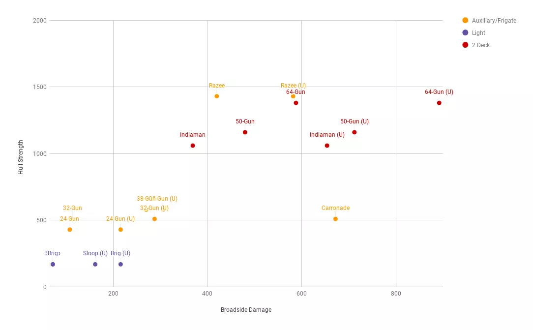 This guide provides an in depth look at the mechanics of naval forces in the context of the campaign, assesses the best use of ship types and highlights the benefits of technology that can be unlocked. Introduction The aim of this guide is to explain the role of different types of ships in battle and how to get the best out of them. Where possible it will avoid restating information that is readily available in other places, and instead focus on data that is somewhat hidden from view, but has a meaningful impact on the units. The strategic context has more impact on naval battles than it does on land battles and this will be explored briefly in the guide. The Role of the Navy In the game, armies exist to capture and defend provinces which are the core to a faction's existence. Fleets cannot gain territory, so their role is more strategic in terms of supporting the overall position of a faction. With only a European theatre and many trade nodes on the same map, Great Britain, France and Spain start off as major naval powers. Over the course of the campaign Russia, Prussia and Austria may make use of fleets more but have roster deficiencies. Broadly speaking, there are five roles that fleets need to fill in the game. Commerce Raiding Trade routes provide opportunities to inflict financial loss on enemies and gain for yourself. As the trade routes exist within the one theatre, raiders are more easily caught so forces may need to be larger than individual ships. Frigates provide more return from raiding than ships of the line, and groups of ships add more than individual units so two frigates in one group will bring in more than two operating separately. As a result, frigates are a far better investment for raiding than larger ships, and this gives a reason for the recruitment of smaller frigates like the 24-Gun/Corvettes. Destroying Trade Fleets If an enemy faction is earning strongly from trade, then it will be due to their trade ships on trading posts. These fleets are juicy targets in wartime, and their defeat not only sets your opponent back in earnings but will net decent prize money. Small fleets of fast, powerful vessels are good for this role as most merchant vessels are poorly armed. Spain, Portugal and Great Britain are very close to many trading posts and therefore can exert control over these. Some nations can build well-armed Indiamen which will stand up to frigates. Blockading and Raiding Ports Blockading a trade port prevent all trade through the port so it is very effective, and if the port is unoccupied it is raided and damaged; unlike commerce raiding, no income is earned by the blockading. Blockading a port does prevent naval recruitment, but if the port is unoccupied your forces can enter and raid which damages the facility and prevents recruitment. If the nation only has one trade port, this can be crippling to their economy. The impact of blockading is often significant enough to justify sizeable home fleets for defence. Home port blockading is therefore high risk and either performed by solo fast ships which are expendable or large enough enough force to make the blockade permanent. Transporting Troops The only way for armies to cross water is via ship. This can present a high risk as the loss of the fleet results in the total loss of the army. As such, it is either best kept to a minimum, or performed with significant protection. Any vessel can transport any number of troops. Destroying Battle Fleets The most basic role for fleets is the destruction of other fleets, generally in response to one of the roles above. Fleets can travel large distances, so a strong fleet in port can project its influence across a wide area, intercepting enemy forces as they appear. The type of vessels needed for this role will depend on what they are countering. To hunt light fast commerce raiders, you will want good fast frigates, not slow ships of the line. Light Ships There are three Light Ship types: Brig, Sloop and Galley. The Galley is only used by the Ottomans. These ships can serve various purposes but are not key role players. SailingBrigs and Sloops are fast. Galleys one of the slowest ships. The Sloop responds better to the wind due to ketch rigging. Brigs can obtain Top Gallants. HardinessLight Ships are some of the weakest ships in the game. They have vulnerable magazines and are prone to explosion in battle. Gunnery Brigs and Sloops have weak but long range (500) broadsides; Uniform Armament more than doubles the damage bringing them much closer to small Frigate power. The Brig has stern chasers. Galleys only have forward firing guns of medium range (450) which are more powerful than any frigate's broadside. Light Ship Roles Commerce raiding: fast enough to escape, cheap enough to be cost effective and expendable (Brigs return more than Sloops) Blockading unprotected ports: fast enough to escape, cheap enough to be cost effective and expendable Transporting armies: can be produced in any port and are fast How to UseFor Brigs and Sloops, the strength of these ships is their speed and manoeuvrability. As such, unless they greatly outnumber the enemy, they need to try to stay at long range, and chain shot the enemy sails. Their speed allows them to dictate when and where combat will happen and the stern chasers on the Brig come in handy. Galleys should sail straight at the enemy vessels, they're too slow to attempt to outmanoeuvre anything. Their powerful guns can cause flooding in smaller vessels and their low profile makes them hard to hit. Very cheap so can be deployed in large numbers. AvoidGetting into range of pretty much any vessel. Light ships can be knocked out in a single volley from a decent ship, and they have poor morale. Cannon Frigates A frigate is a warship that prioritises speed over combat ability. They can be defined by the saying "they outgun what they can't outrun, and can outrun what they can't outgun". They are truly multirole and will find a lot of servi
