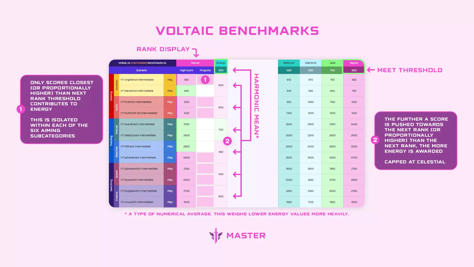 肌肉记忆 可以理解,不同游戏社区中存在许多关于灵敏度的看法和担忧,这可能会让新手感到困扰。其中一个最常见的误区是,你必须在所有设置中始终使用相同的灵敏度,以确保在瞄准时有“肌肉记忆”。这是对神经科学中一个重要概念——运动记忆的过度简化且不准确的理解。由于瞄准方面几乎没有正式的研究,因此即使将肌肉/运动记忆作为一个恰当的神经科学概念来讨论,也最好不要过于担心,因为它在瞄准中所起的作用尚未被充分理解。随着时间的推移和经验的积累,许多技术娴熟的玩家已经证明,调整鼠标灵敏度是完全可行的,而且在不同游戏中使用不同的灵敏度也是可以的。 ### 理解视野(FOV) 瞄准训练新手常有的一个误解是,在“错误”的视野(FOV)下进行训练会阻碍进步,尤其是当训练时的视野与他们主玩游戏的视野不同时。**视野与瞄准能力的提升并没有直接关联,但它确实会影响你的瞄准训练方式。** **当你增大视野时,你的可视范围会更广,这能让你一次性获取更多信息,在广角场景中尤其有用——在这类场景中,你可能在某个特定时刻屏幕上没有任何可用信息。**这通常适用于目标切换场景,例如VT闪避切换或VT球体切换。这并不是说使用更高的视野(FOV)没有缺点,因为它会使目标看起来更小,因此对某些人来说瞄准目标会稍微困难一些。更高的视野还会在屏幕边缘造成失真,类似于鱼眼效果。最让大多数人感到意外的是,更高的视野会使灵敏度感觉更慢。 对于较低的视野,情况则完全相反:你获得的信息更少,目标看起来更大,失真更少,并且灵敏度感觉更快。使用较低的视野并没有太多好处,但你可能会发现两个优点。更清晰地查看自己的鼠标移动轨迹,这有助于暴露你在平滑度熟练度上的不足。 降低视野(FOV)可能有助于让目标显得更大,尤其在需要精准瞄准的情况下。 降低视野的第一个好处是非常合理的,但第二个好处通常不被推荐。为了让特定场景变得更容易而降低视野的行为被称为“取巧(cheesing)”。取巧指的是你为了分数而采取某种行为,而非为了提升自身水平而进行游戏。 其他设置 《Aim Lab》提供了其他可调整环境的设置。这些设置大多取决于个人偏好,在大多数情况下不会影响练习质量。不过,以下是一些你可能想要根据个人喜好调整的设置: - 墙壁和地面的颜色/纹理 - 机器人颜色 - 准星 - 命中/击杀/重生音效 - 用户界面元素 所有这些设置都取决于个人偏好,但如果你不确定,可以看看一些顶尖瞄准玩家的设置并尝试模仿。你可以花时间去试验自己喜欢和不喜欢的,或者哪些有效、哪些无效。就像视野(FOV)和灵敏度一样,定期更改设置并没有坏处,只要你不过度将自己作为玩家可能遇到的任何困难归咎于这些设置。 如何进行瞄准训练 既然我们已经讨论了为什么应该进行瞄准训练,并且你已经完成了环境设置,你可能想知道从哪里开始。开始上手的最佳方法之一是先确定自己的技能水平,然后据此进行训练。 **确定你的技能水平** 我们建议先通过游玩我们的新手基准测试[go.aimlab.gg](链接:https://steamcommunity.com/sharedfiles/filedetails/?id=2790274927) 编辑:已更新链接[app.voltaic.gg]来确定你的技能水平。首先,你需要获取并复制我们的Aim Lab进度表[docs.google.com]。每个场景游玩约5次,完成每个场景后,将你的最高分输入进度表。之后,你会在进度表顶部附近看到自己的等级。如果你达到了黄金级,就可以继续进行中级基准测试,并按之前的步骤操作。完成后,你将获得一份完整的表格,其中会显示你的优势和劣势。