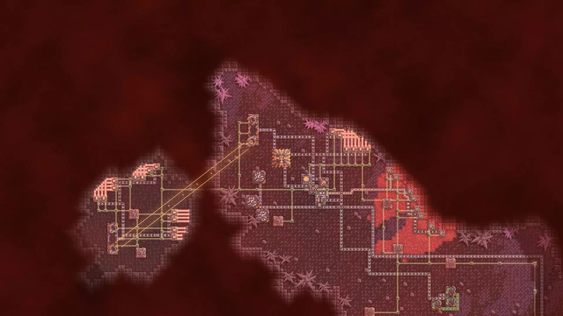 这张以及后续的地图,我是在开始写攻略之后才通关的,所以按理说评价会更详细一些。(其实并没有) 刚刚攻占了一个区域,总共花了整整2小时。过程中完全没遇到什么问题,因为敌人实在太少了。不过也有可能是我防御部署得太强大了,虽然每侧只放了一个“苦难”单位,这恐怕算不上什么好防御吧。 先从地形说起。我挺喜欢它的,有点像“阿特拉斯”地图——一方面只能通过蜘蛛区域,另一方面则需要穿过熔渣地带等等。你的基地位于中央,下方两侧有通往敌方基地的通道。开局的资源非常丰富,但钍需要用弹射器运输,能源来源则是热解发电机。一开始可以不用太在意防御,因为正如我所说,敌人数量不多,而且他们不会很快到来。因此,与前一个区域相比,难度并没有那么高,但敌方基地的防御会增加难度。它们的防御非常严密,此外,该区域的一些基地被护盾包围,要想关闭这些护盾,需要摧毁另一个敌方基地。总的来说,由于这张地图流程相当短,还没等你感到厌烦就已经通关了,因此会留下不错的体验,所以我给这张地图打9/10分。 Karst | 喀斯特