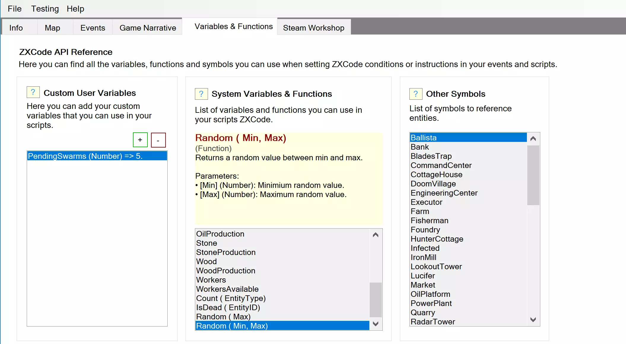 С языком ZXCode вы можете добавить гораздо больше функциональности в сценарии и события. Вы задаете сложные условия для запуска действий или событий, а также управляете своими собственными игровыми переменными. Все действия теперь имеют два новых параметра: Условие и Код выполнения. События также имеют параметр Condition. С этими новыми элементами вы можете реализовать гораздо более сложные игровые механизмы для ваших уровней. Примеры: Дерево политической системы, управление счастьем колонистов, выбором и последствиями решений игрока, управление торговлей с иностранными колониями, индивидуальные цели, чтобы выиграть или проиграть игру ... Чтобы достичь этого, мы создали простой язык с синтаксисом, похожим на c #, c или c ++. Пример: MyVariable = Колонисты + Рабочие (Colonists + Workers) * 10; (Count(Unit) >= 100 && Count(Wonder)>=3) || IsDead(Bob) В коде вы можете ссылаться на любую игровую переменную или функцию и свои собственные переменные. Список игровых переменных и функцийНа странице перечислены все переменные и функции. Выберите один, чтобы увидеть помощь выбранного элемента. Также у вас есть список символов для сущностей, так как необходимы некоторые функции. Например, для функции Count (Entity) необходимо передать тип объекта, выбрав один из доступных в списке символов. Пример: «Count (Ranger)» возвращает количество живых рейнджеров в игре. Примечание: список переменных и функций будет расширяться с будущими обновлениями, время от времени проверяйте список, чтобы увидеть изменения. Задание условий для запуска действий или событийСобытия и действия теперь имеют новый параметр с именем Condition (ZXCode), где вы можете написать пользовательское условие, используя ZXCode. Если условие действия ложно, то действие и его дочерние элементы не будут выполнены. Для условий вы можете ссылаться на любую функцию, число, пользовательскую переменную или игровой символ и использовать любую комбинацию с операторами и круглыми скобками. Операторы доступны:==Comparator Equal: "Days == 100". Only true if the current day is 100. Истинно, только если текущий день равен 100. !=Comparator Not Equal: "Days != 100". True for all days except 100. Компаратор не равен "дни !=100". Правда для всех дней, кроме 100. >Comparator Greater than: "Days > 100". True for days 101, 102... Дни> 100. Правда для дней 101, 102... >=Comparator Greater than: "Days >= 100". True for days 100,101,102... Правда для дней 100,101,102 .. <Comparator Lesser than: "Days < 100". True for days 99, 98,... Компаратор Меньше чем: «Дни <100». Правда на дни 99, 98, ... <=Comparator Lesser or equalthan: "Days <= 100". True for days 100, 99, 98... Компаратор Малый или Эквивалентен: «Дни <= 100». Правда для дней 100, 99, 98 ... &Logical And: "Days>=100 & Days<=103". True for days: 100, 101, 102,and 103. Верно для дней: 100, 101, 102 и 103. |Logical Or: "Days<=5 | Days ==100". True for days: 0,1,2,3,4,5 and 100. Правда для дней: 0,1,2,3,4,5 и 100. !Logical Not: "!IsDead(Bob)". True if Bob is not dead. Верно, если Боб не мертв. +, -, *, / Arithmetic operators : "Gold > (Workers * 2 +10)". True if the gold reserves are greater than the number of workers multiplied by 2 plus 10. Арифметические операторы: «Золото> (Рабочие * 2 + 10)». Истинно, если золотые запасы превышают количество рабочих, умноженное на 2 плюс 10.ПримерВыиграйте игру, когда в колонии 10000 человек: просто создайте событие, проверьте параметр Game Won и установите условие: Colonists >= 10000Дайте бонус игроку, когда в его армии 100 солдат и 100 снайперов: (Count(Soldier) >= 100) & (Count(Sniper) >= 100)Проиграйте игру если солдат герой с NameD = "Боб" мертв: IsDead(Bob)Выиграйте игру, когда все Doom Buildings будут разрушены: Count(DoomBuilding) == 0Торговец продает Титан в колонию за 1000 золота и 50 единиц железа, но только если у вас есть ресурсы: Gold >= 1000 & Irons >= 50О