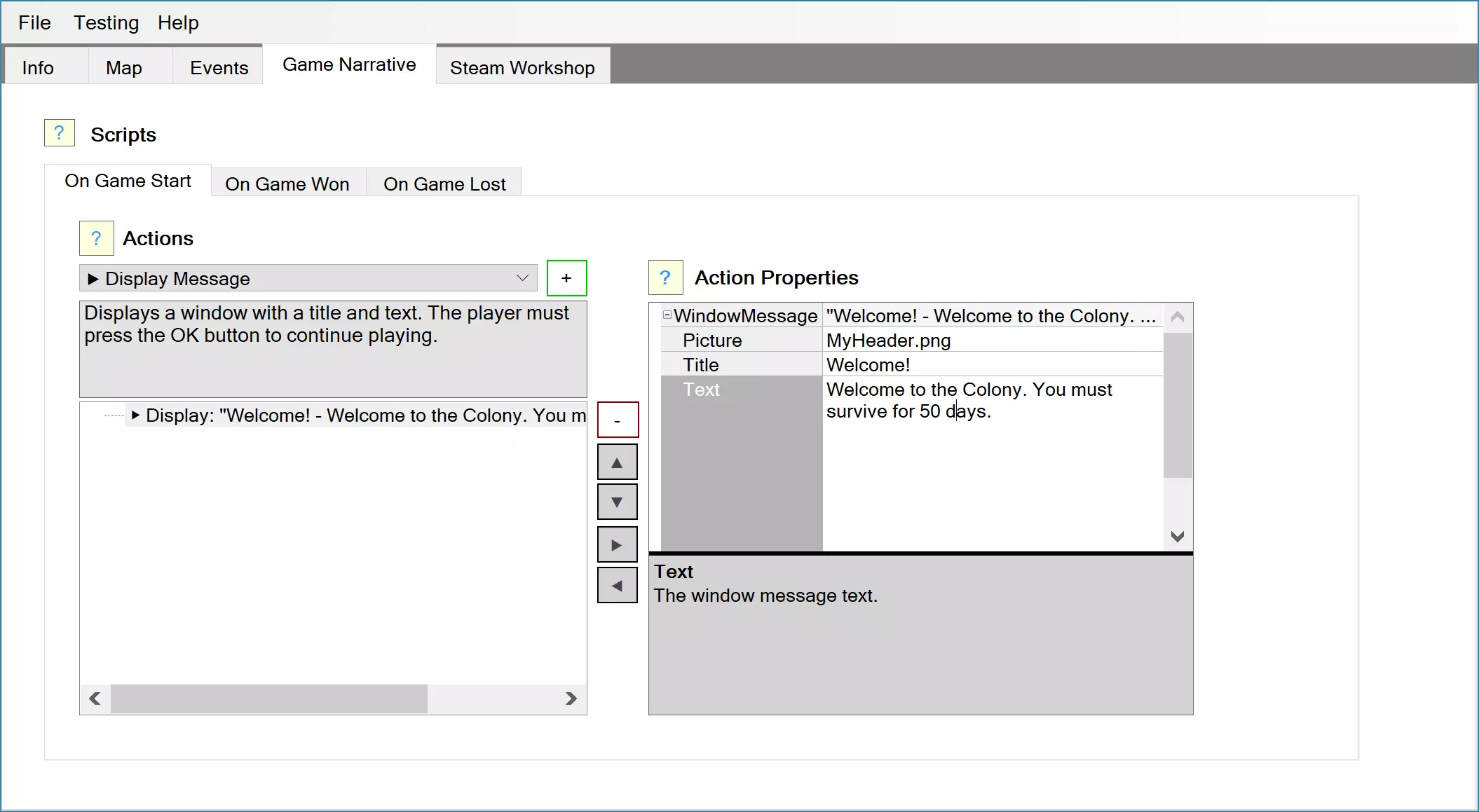 脚本是按顺序执行的一系列操作。脚本可以通过关卡事件或其他特殊游戏事件来触发(参见游戏叙事 Narrative)。借助脚本,你可以显著提升自身水平,还能创造出内容极为丰富的故事以及专门的新机制或给玩家的惊喜。未来更新中将增加更多可用操作。以下是您当前可以使用的部分操作:向玩家显示消息。为殖民地添加/移除资源。为殖民地提供 bonus buildings(额外建筑)或分支部门。向殖民地提供科技。感染随机房屋。从生成器生成单位。显示玩家将选择的参数集。执行随机操作。脚本动作的创建与管理 每种动作类型都有其自身的参数集。首先选择您想要添加的动作类型,然后点击“+”按钮。 使用“-”按钮删除所选动作。 使用▲和▼按钮来更改同一模块内动作的顺序。嵌套动作(Nested Actions) 某些动作,例如“随机动作”“模块”或“选择”,可能包含嵌套(子)动作。当您创建新动作并选择可以包含子动作的动作时,该新动作将创建在所选动作内部。使用◀按钮可将所选动作从当前块中移出。使用▶按钮可将所选动作放入下一个/上一个动作块。动作属性每个动作都有其自身的属性。参考消息将显示在动作属性下方,用于描述动作的每个参数。 循环(Loops)有两种用于控制循环的动作:循环(Loop)和退出循环(Exit Loop)。循环会无限执行其子动作,直到执行退出循环动作。这对于创建带有“返回/退出”选项的复杂菜单或对话系统非常有用。 注意:使用循环时请小心。如果您忘记添加“退出循环”操作,脚本将永远不会结束,您必须通过按下ALT + F4来关闭游戏。 测试您的关卡 在发布您的关卡之前,您必须在本地对其进行检查。这非常简单。只需使用“生成关卡”菜单选项,用户关卡就会创建在此文件夹中:Documents My Games They Are Billions CustomLevels。然后启动《亿万僵尸》,在游戏主菜单中依次进入:新游戏(New)=> 自定义关卡(Custom Level)。在下一个屏幕上,你会找到所有已订阅的关卡[STEAM]以及CustomLevels文件夹内的所有本地关卡[LOCAL]。你可以从那里开始游戏并像往常一样游玩,以测试关卡。您也可以保存游戏进度,之后从“继续游戏”(Continue)设置菜单中加载。 注意 地图、关卡事件和场景均保存在游戏存档文件中,因此如果您在编辑器中对其进行了修改,需要开始新游戏才能使更改生效。 在创意工坊发布您的关卡 发布关卡前,请先在本地进行测试,确保一切都能按预期运行。请查看“测试您的水平”部分。