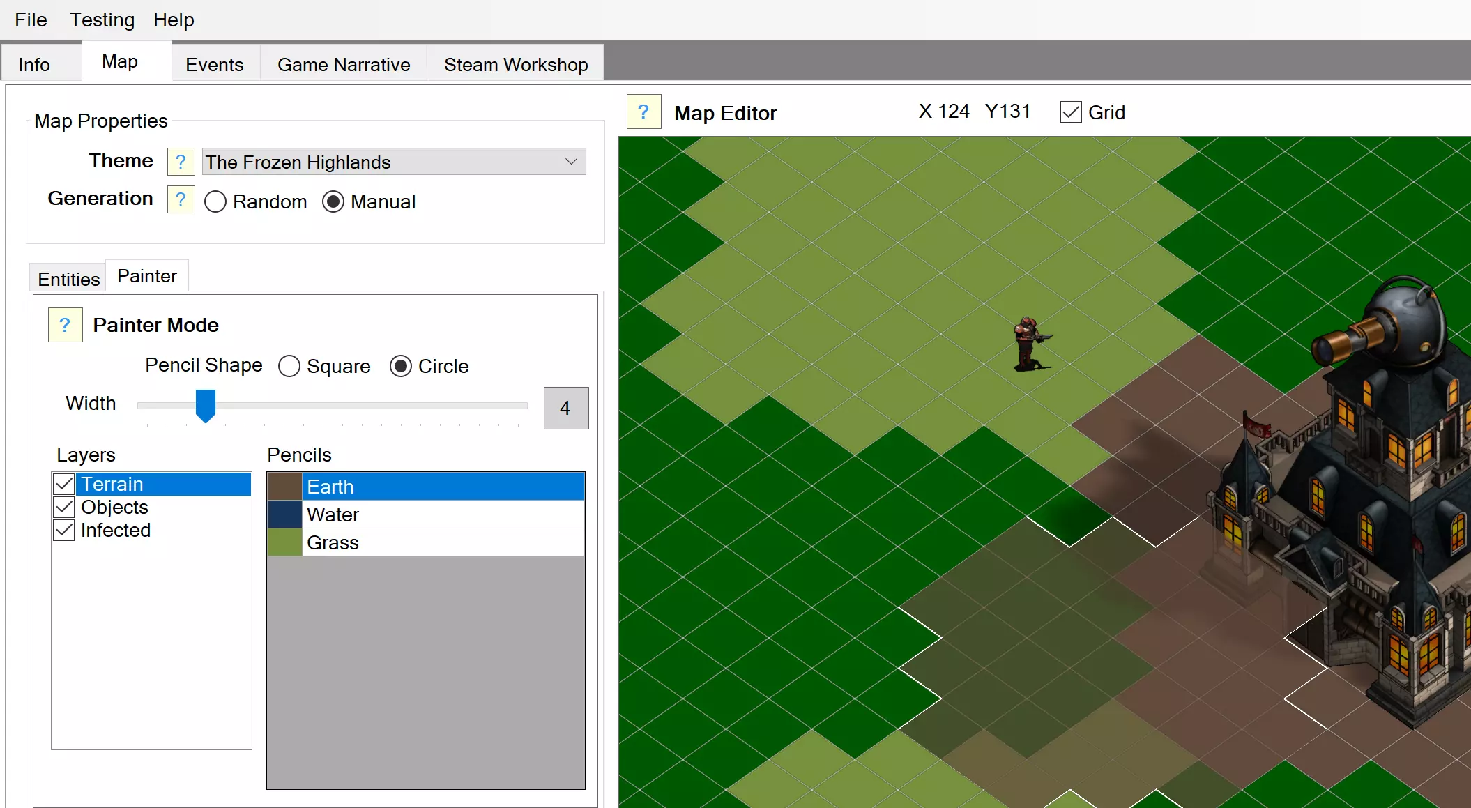 在绘画模式下,您可以非常轻松快速地编辑地图的以下方面: - 地理:山脉、森林、地形、矿产资源…… - 受感染人口。 操作方法 要在地图上绘制,您只需选择铅笔,然后使用【左键】直接在地图上绘制。 - 每个系统都有不同的图层:地形(Terrains)、物体(objects)、感染者(infected)。- 每个图层都有其专属的地图绘制铅笔。 - 您可以通过勾选每个图层左侧的选项来显示/隐藏不同图层。 - 您还可以选择铅笔的宽度和形状。 - 若要擦除图层上已绘制的部分,请使用组合键【ALT】+【鼠标左键】。 一旦您返回实体模式(Entities Mode),地图将自动更新,此过程可能需要几秒钟。地图编辑器画家模式(Painter mode)操作指南 以下是您可在地图编辑器中直接执行的基本操作。 - 按住鼠标左键并拖动,使用所选铅笔进行绘制。 - 按住鼠标右键并拖动鼠标,移动编辑器视角。 - 按住鼠标左键 + ALT 并拖动,擦除当前图层。 提示与建议 - 先进行地图的地理布局工作。一旦您对此满意,就从手动实体(manual entities)开始。 - 把受感染的居民留到最后处理。地图上受感染的居民过多会严重影响编辑器的性能,因此请在处理完所有其他部分后再使用感染铅笔(Infected Pencils)。 关卡事件(Level Events) 关卡事件