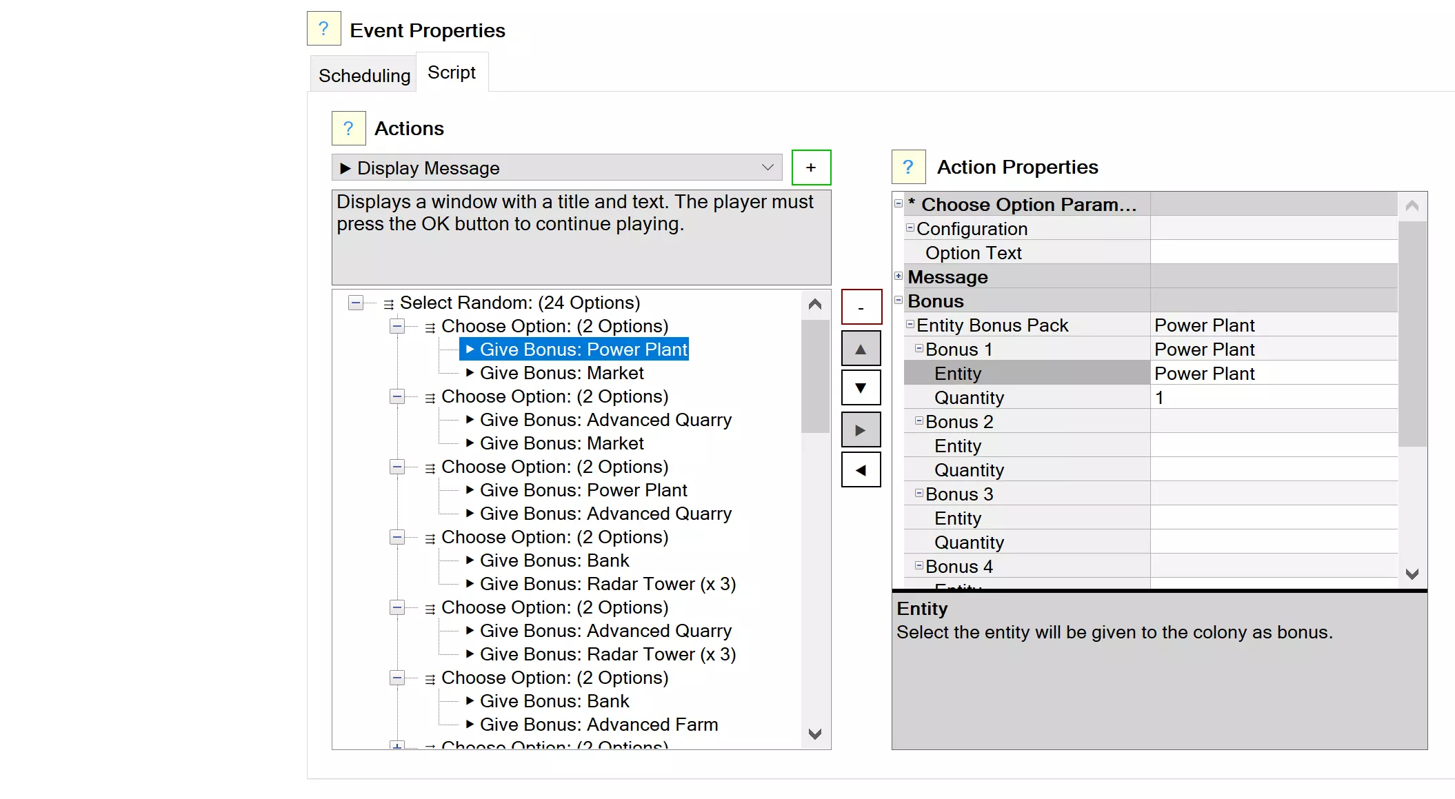 事件系统是游戏关卡不可或缺的一部分。事件用于:启动感染群体。判断游戏何时胜利或失败。执行用户脚本。特殊操作,例如:显示完整地图或将所有感染者送往殖民地。添加和删除事件。点击+和-按钮,以添加或删除列表中的事件。事件规划 对于每个事件,你需要设置:事件在何时(哪一天)触发。 可以触发多次还是仅触发一次? 事件触发时会发生什么? 要定义事件,请在右侧填写事件属性。每个字段都有自己的说明,显示在底部面板上。建议:若要展开或折叠类别或属性,请双击元素图标。 时间语法 游戏时间可以以天或小时(游戏殖民地时间)为单位指定。若要使用天,只需在数字后添加符号“d”:“4d” = 4 天。 若要使用小时,请使用符号“h”:“8h” = 8 小时。 您还可以指定如 2 天 8 小时这样的时间:“2d 8h”。生成器语法 当您指定事件在启动时生成单位(被感染单位)时, 您必须指定将从中生成单位的生成器。 生成器在“地图”部分中定义。默认创建了4个生成器:N、S、E、W。 您只需编写生成器名称标识符,后跟AND运算符或OR运算符。使用“或”运算符时,游戏会在事件触发时随机选择使用哪个生成器。示例:单位必须仅在生成器N上生成:“N” 单位必须在生成器N和S上生成:“N和S” 单位必须在四个生成器中的一个中随机生成:“N或S或E或W” 单位必须从生成器N和S或E和W生成:“N和S或E和W”场景(Scripts)尽管事件通常用于生成集群,但您也可以使用它们来运行用户自定义场景(显示消息、提供殖民地资源……)。有关更多信息,请参见脚本(Scripts)部分。 叙事(Narrative) 游戏叙事