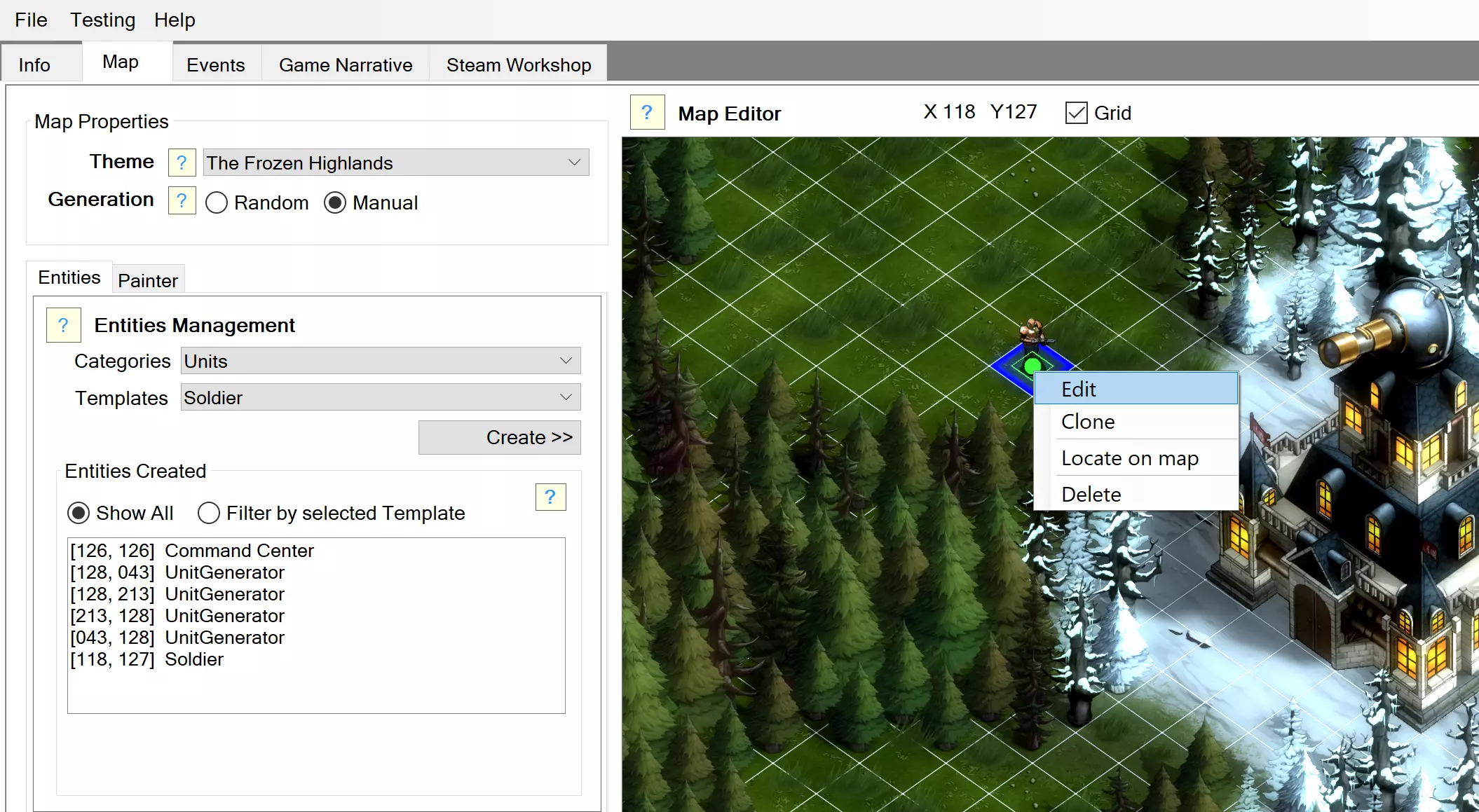 在这里您可以手动创建对象并编辑其属性。 游戏中的每个元素都是一个实体,例如单位、建筑、装饰物…… 若要快速编辑地图地形或添加受感染人口,请使用画笔模式。 实体列表 在这里您可以管理手动添加到地图上的对象。 您可以显示所有对象,或按所选模板筛选它们。- 左键点击 => 选择对象。 - 双击 => 选择对象并将其在地图上居中显示。 - 右键点击 => 显示上下文菜单。 - 【Delete】键 => 删除选中的对象。 注意1:指挥中心是生存模式中必需的,因此无法删除或复制。注意2:空白地图默认配备对象生成器(N、S、E、W),以便于确定集群位置,但您可以根据自己的意愿对其进行编辑或替换。 对象可以有多个配置参数,请使用其上下文菜单中的“编辑”(Edit)参数来查看/修改其属性。例如,生成器标识符、将区块设为精英……实体创建 点击此处可将所选模板的对象添加到地图上。 您可以直接在地图上使用CONTROL + 左键点击轻松创建对象。 对象模式(Entities Mode)下的地图编辑器操作 以下是您可以在地图编辑器中直接执行的主要操作。 - 点击对象上方的鼠标左键以选择该对象。- 您可以直接移动对象,方法是点击并拖动所选对象的绿色圆圈。 - 双击可选择对象及其模板。 - 按住鼠标右键并拖动鼠标,可移动编辑器视角。 - 在对象上点击鼠标右键,可显示其上下文菜单。 - 按【Delete】键可删除所选对象。- 若所选物体可旋转(例如大门),请按【TAB】键旋转该物体。 “画家模式”(Painter Mode)