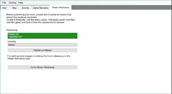 请确保Steam客户端正在运行并已连接到互联网。您可以选择您的工坊可见性:公开、隐藏或仅好友可见。点击发布按钮以上传您的关卡。如果需要,您可以添加更新日志备注。物品上传后,您可以前往该物品的Steam创意工坊页面。在那里您可以添加更多图片、描述、指南、讨论……就像Steam创意工坊的其他任何元素一样。当物品公开发布后,它将对整个社区可见,任何玩家都可以订阅你的关卡来游玩。字符串、本地化和随机文本