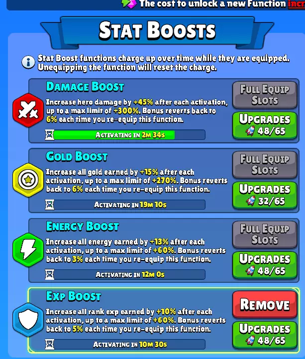 与当前等级可获取的其他升级相比,提升3%或6%的经验值完全不值得。 最终你会想要解锁这些内容,按以下顺序解锁: 1) 经验值或能量 2) 能量或经验值 3) 金币 4) 伤害 首领刷新