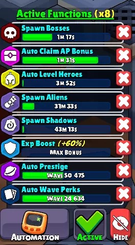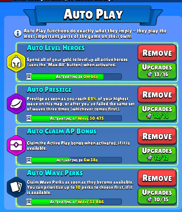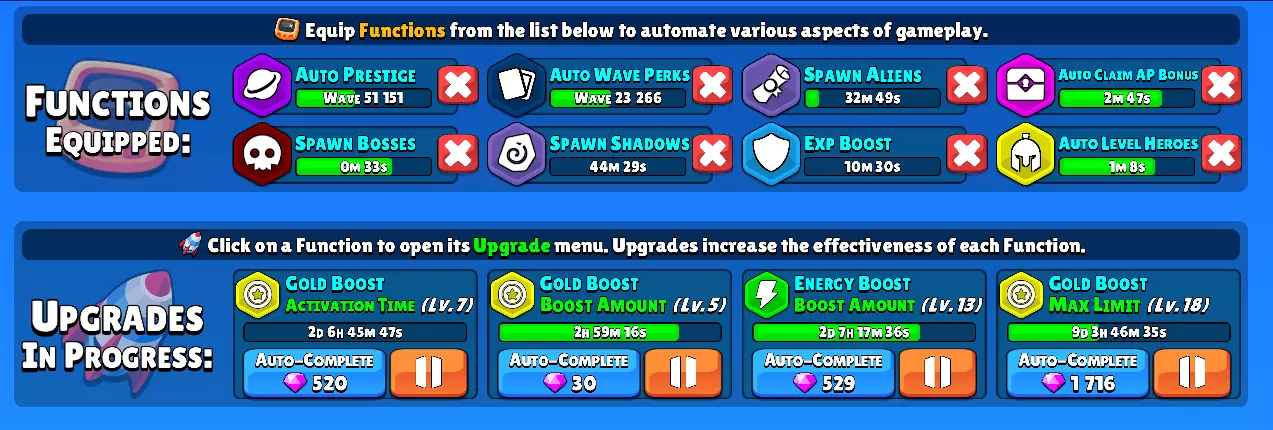 升级 功能分为3类: - 属性强化 - 自动战斗 - BOSS召唤 每个升级板块都有其独特的侧重点。 何时解锁自动功能? 自动功能在第2000波解锁。 但这并不意味着所有升级都会在2000波时全部可用。 例如,终极BOSS需在第5000波解锁,因此其相关功能也将从5000波开始解锁。 注意事项 获取更多自动功能需要消耗能量,这意味着你无法立即获得所有可用的自动功能。在2000波解锁自动功能时,对于你当前的等级而言,获取这些功能的成本会比较“高昂”。 应该优先升级什么? 这完全取决于你自己。我会给出一些个人建议,但升级顺序很大程度上取决于你当前的游戏风格。例如: 全天候游玩 如果你保持活跃在线并让游戏全天候运行,那么你肯定会需要以下自动功能: - 自动 prestige - 自动升级英雄 - 自动领取 AP 奖励 自动波次增益目前不在考虑范围内。你将在第 5000 波解锁自动波次增益,但在那个阶段自动领取它们并非特别有益,因为你能获得的波次增益数量有限。当你能达到更高波次时,它才会变得更有价值。