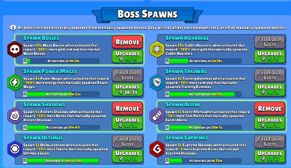 在我看来,最佳的首领生成方式如下: S级:生成外星人、生成首领 外星人卷轴非常好用,并且通过自动化生成外星人(或远古暗影)时,不会增加它们的生命值。 生成首领对于刷经验值和金币来说非常出色,因为首领能提供更多的经验值和金币。 A级:生成远古暗影、生成训练师、生成至尊、生成终极者 生成至尊或许也能达到S级,但仅限于刚解锁的时候。在某个阶段后,它会变得过时(或者至少价值降低),而外星人卷轴会比至尊符文更有用。 生成终极者也非常不错,但我不会在暗影或训练师之前优先选择它。因为在游戏早期,你无法快速击杀它们来获取代币。波数越低,它们掉落的代币数量就越少。E级 刷怪囤积者 刷怪能量法师 目前没有太多实际用途,在游戏中可以用来体验一些“有趣的玩法”,但并非必需。 我不建议获取这些,而是更应该专注于属性加成。不过最终解锁它们或许能加快完成每日和每周任务的速度。 自动化解锁顺序 1) 自动 prestige、自动领取 AP 奖励、自动升级英雄 2) 自动刷外星人、自动刷 Boss 3) 自动刷远古暗影 …… 具体可根据你的游戏进度来决定,但1-3基本上是“必点”的。 感谢阅读! 此致 Cypher
