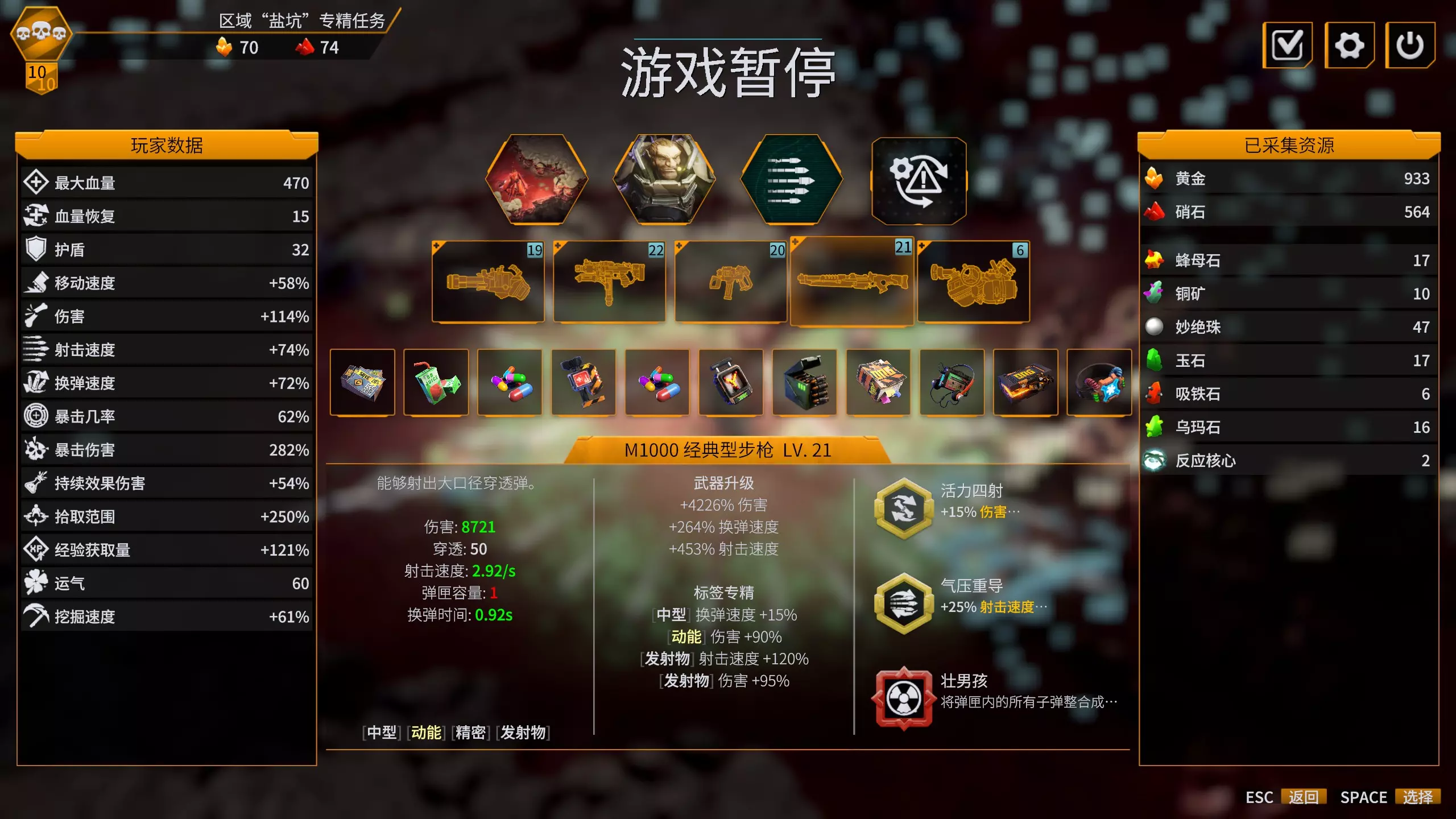 (其实本来还有个副标题——基于一个原版冰钻玩家的视角) (话说,这游戏里钻机的875小饼干呢?) (还好这游戏没有温度的设定,所以可以冻住后用火伤打持续伤害(DoT)。你们要是去原版用火雷配合冰枪,可千万别把为师供出来) 局外升级建议 本游戏中共有六种可带出战斗的稀有矿物(黄金和硝石是局内货币),各自对应六列局外升级。不同的矿物在四张图中分布情况不同,如白色的妙绝珠就在盐坑、藤络树洞中分布较多,在水晶洞穴中鲜少存在。**单项升级所需矿物会越来越多,好在即便深潜失败也能全额带出它们,可以在挑战过程中慢慢积攒。**一些升级会用到“反应核心”,它存在于专精任务或异常任务中的第4或第5层(武器专精固定在第2层,速刷的话推荐打这个;生态区域专精因为共10层,所以会在第9或第10层中出现第二个),在地图上会有类似于补给舱的醒目标识,走过去凿开容器即可回收,但也要注意回收后似乎会加强虫潮。基础任务中是没有反应核心的。