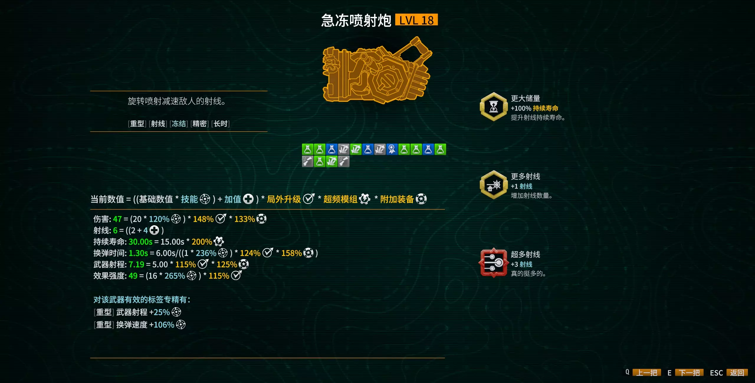 冰枪的模组比较朴实无华,前两个模组值得选择的基本只有射线和寿命,如果都没有的话可以考虑回收成紫升级,运气好的话说不定能出个直升3级的皮肤。“冷到极致就是烧”模组个人感觉适合打打武器专精这类主升一把武器的情况,冰枪本身攻击距离较短,最好还是把铺点燃的工作交给火雷或点燃火箭吧。