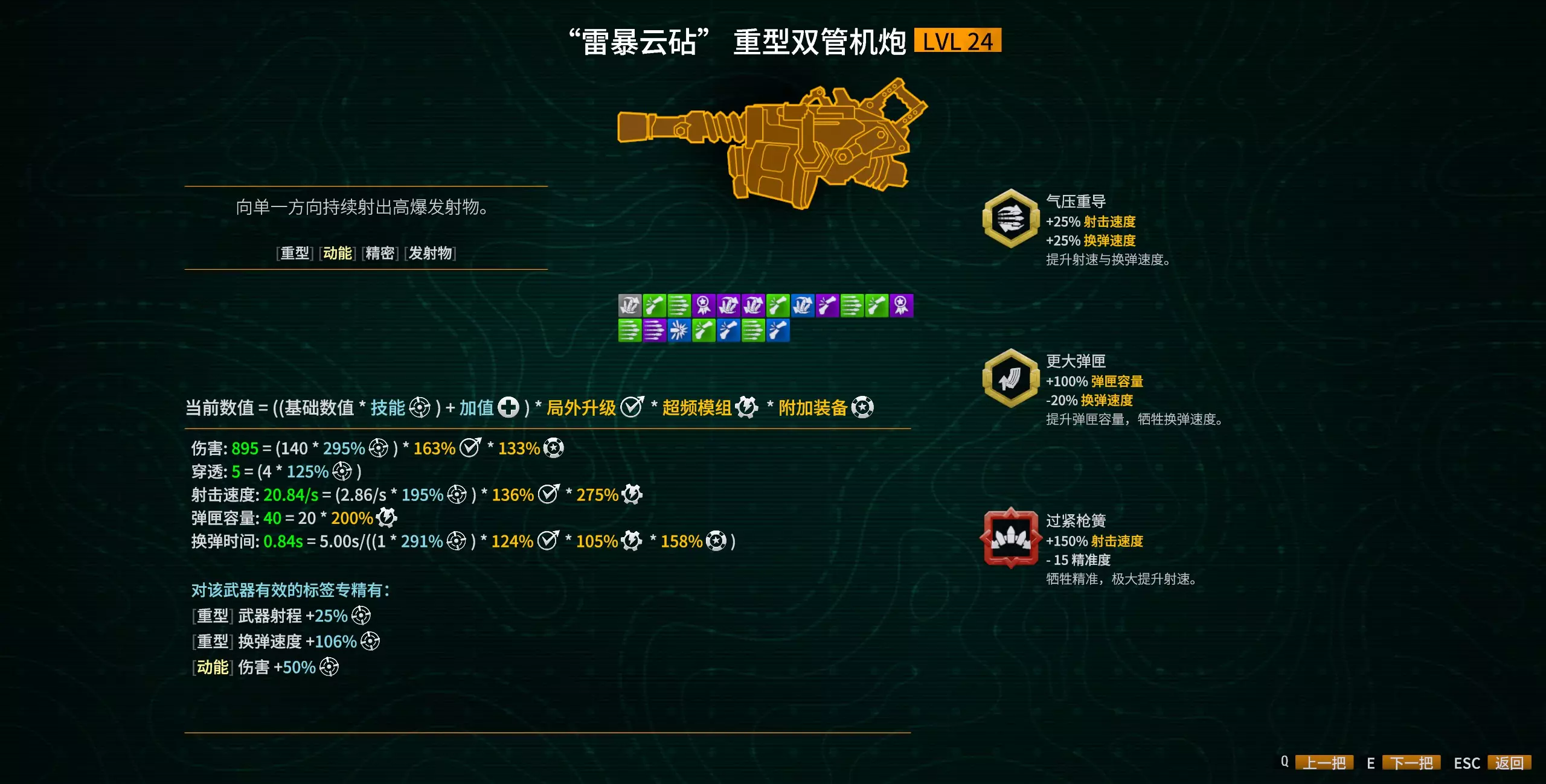 机炮第一个模组的装填速度加成抵消了第二个模组的惩罚,最终模组的装填速度为105%;而第二个模组提供的大弹匣,为最终模组的高射速提供了更长的输出窗口。最终搭配出的是一把高射速+大弹匣且装填速度也很快的直伤武器。