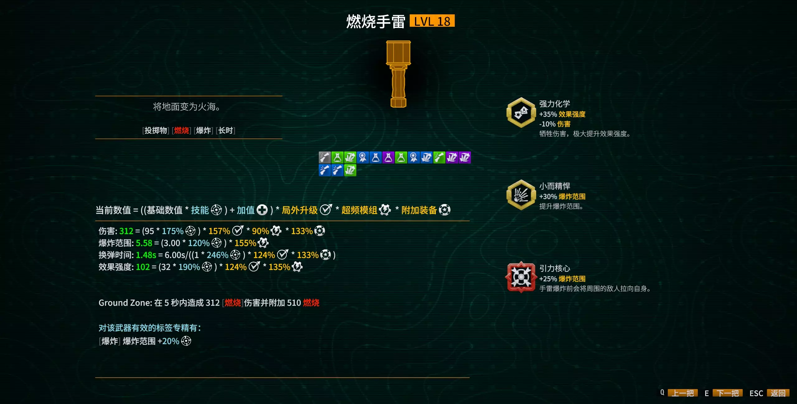 火箭筒的点燃地面模组是冰火流的必选,如果前两个模组都没出点燃效果的话,那么这把武器在本局中基本可以雪藏了。另一个模组可选择爆炸范围或是+3弹匣,其中选择+3弹匣的话,配合最后终极模组的弹匣翻倍效果会变成(9+3)×2=24发,挺适合直伤路线(不过直伤路线也有“心头之好”模组竞争)。