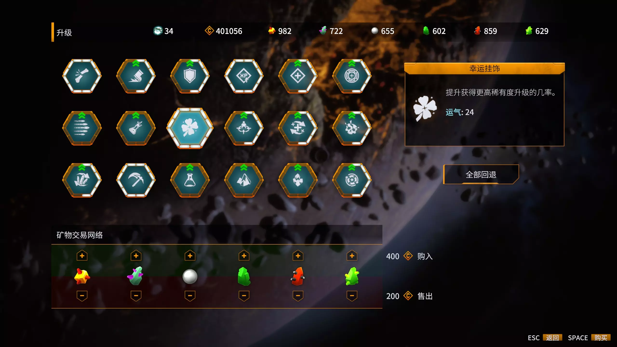 下面是作者个人对每列中升级项目的优先级建议,总体会更偏向于冰火流的控制+持续伤害(DoT)的需求,大家可以根据个人具体需求进行调整(表格从上到下六行对应从左到右六列): | 矿物名称 | 对应升级建议 | 补充说明 | | --- | --- | --- | | 蜂母石 | 伤害>>换弹>>射速 | 控制+持续伤害(DoT)对射速基本无需求,甚至对直接伤害要求也不高,加伤害主要是为了前期的过渡更舒服些。如喜欢发射物武器可提高射速优先级,但伤害碾压射速的地方就在于它的增伤方式不会额外消耗弹药。 |铜矿:挖掘速度≥移速>>>持续伤害(dot伤害)。持续伤害对我们元素流派很重要,但挖掘和移动速度直接影响做任务和探索地图,会更加重要。另外,挖掘速度不够很容易被虫子追上多咬几口,初期可以多点些挖掘。 妙绝珠:运气>>>>>护盾>效果强度。护盾减伤确实很强,且剩余越少时升级收益越高;但运气是少有的能影响全局大部分数据的参数,运气上去了给一个更高级的升级就能弥补缺少的数值,更何况一局里要用到运气几十次。 玉石:经验值(xp)>>>拾取范围>初始硝石。经验值的重要性毋庸置疑,不过初期可以适当加点范围让拾取更轻松些。吸铁石:血量=血量恢复>>初始黄金。建议血量和回血对点,当然初期血少可以先点一些血量。 乌玛石:刷新>>暴击几率>=暴击伤害。控制+持续伤害(DoT)流派确实用不到暴击,而对其他流派来说,1个百分点的暴击率结合200%的暴击伤害计算,期望伤害加成仅为1%,建议参考蜂母石第一项;暴击伤害的收益更低,以25%的暴击率计算,4个百分点的暴击伤害加成带来的期望伤害加成仅为1%。 个人认为,大部分属性升到一半就能在难度3有较好体验,基本全升满能在难度5有较正常的体验。难度3大约需要局外属性+职业属性+局内属性凑到二三十的护盾,难度5则需要50左右的护盾才比较舒服。 地图简介
