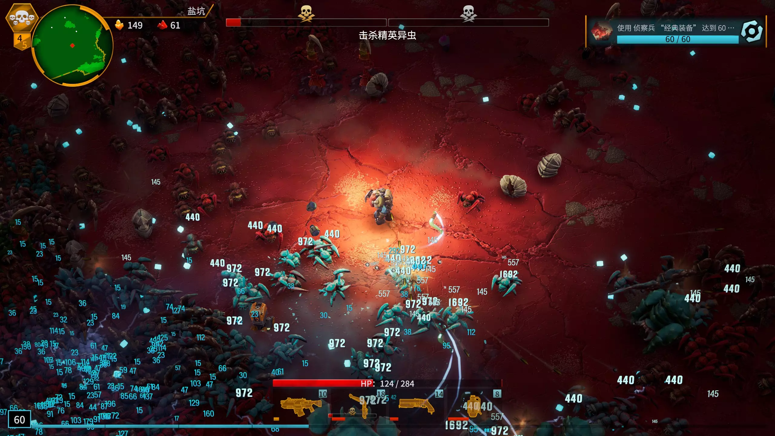 20241109更新: 蔚蓝花甸的核心就是伤害,伤害,还是伤害!该地图值得注意的一点是没有能帮忙输出的自爆单位,因此对输出的硬性要求更高,自身输出不足的话将无法通关。(由此也能看出,困难5难度要求集齐4把冻结武器是多么苛刻的设定,全套冻结武器虽然控制能力强,但输出能力欠缺,实在难以应对。)此外,很多时候可以直接使用蹦床进行采矿,而从蹦床跳出的距离与移动速度相关,所以在本图中移动速度的优先级会比挖掘速度高很多。 另外分享一下该地图困难5难度的两个目标心得: **装备4把冻结武器**:集齐4件相同元素的武器都比较依赖运气,而4件冻结武器由于清怪能力较弱,且本图没有自爆单位帮忙输出,所以会麻烦很多。个人感觉比较好的路线是使用侦察兵经典装备,副武器拿霰弹枪补充伤害,第三格带冰雷,第四格带冰冻无人机。武器主要升级GK2步枪和霰弹枪,寻找冻结模组(如果一直不出冻结模组,升到12级都没有的话建议重开),冰雷和无人机没有太多升级的必要。前期清理杂兵会比较吃力,最好补充一些穿透词条,或者拿到腌制硝石、侧目目镜之类的伤害核心装备。(注意不要拿弩,即使点出添加冻结弩箭的模组也不会有冻结词条,经验之谈……) 使用任意子职业达到70级:想要升到70级,要尽可能晚击杀BOSS,像火雷、火箭筒这类会乱射误伤到BOSS的武器最好少用,主要多加点移速来遛BOSS,拖延到虫群强度提升,少攻击BOSS多清理杂兵。使用审问者职业装备冰枪,并装配模组“冷到极致就是烧”,同时主要强化冰枪的效果强度和装弹时间,这样可能会比较顺手(冰枪射程较短,在移动时难以击中BOSS,反而在此处成为了优势)。另外,在完成该目标之前,建议先去挑战蔚蓝花甸地图的专精任务,专精可以增加经验值获取量和运气。 职业简评与对应武器推荐 部分子职业能够使用其他职业的武器,从而拓展出更丰富的打法。此外,不同职业的特定子职业甚至可以选用相同的武器,并采用类似的打法。因此,作者将结合子职业的特点,给出相应的武器选择个人建议。当然,作者由于常年玩冰火流“轮椅”玩得目光呆滞、极度自卑、且智商逐年下降,所以这章也主要是从冰火流的视角来评价职业和推荐武器,难免或者说必然会有遗漏乃至偏颇之处。大家如果有其他好用的搭配,欢迎在评论区里补充。 侦察兵血量较少,也比较缺乏范围伤害(AOE),面对虫群时相对其他职业来说比较乏力。总体而言比较考验玩家的理解和技术。 经典装备可以说是没有特性的子职业,高难下用于挑战自我。移速加成相当于一个蓝色升级,血量加成相当于一个绿色升级,然后就没了。我个人挑战《盐与避难所》困难5难度的目标“用经典装备升到60级”时打得相当难受,甚至想着靠附加装备“武器补给箱”抽取其他职业的强力武器来打。最后还是靠着腌制硝石增伤,回旋镖清理杂兵,步枪和霰弹枪搭配冰模组进行控制并近身对抗BOSS,再加上分裂冰雷补充控制的方式才达成目标。