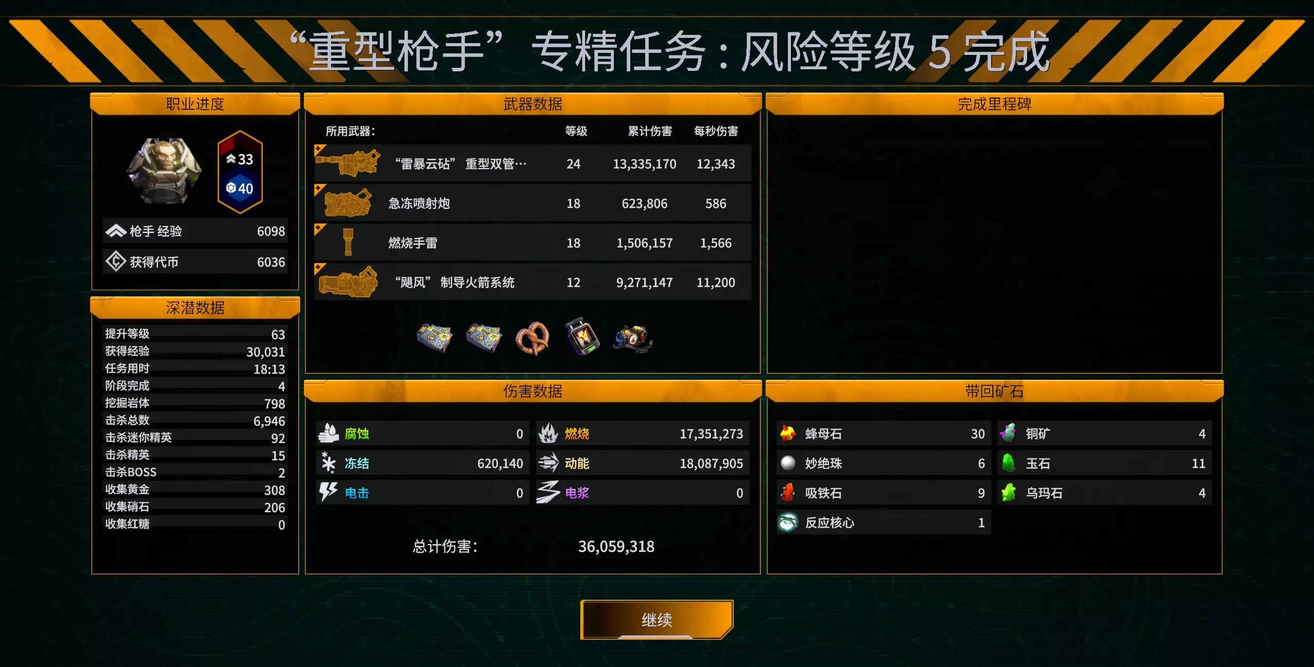 火雷这个是一套比较失(脸)败(黑)的构筑,没有拿到分裂模组。火雷前两个模组里个人推荐分裂>效果强度>爆炸范围,分裂能够铺得更广,给更多的虫子上点燃;效果强度也不错,135%配合其他升级进行乘算,能大大提高点燃的dot伤害,另外也是为了弥补子母雷减少的效果强度。 局内的部分就先到这里了。大家如果有疑问或是建议,欢迎在评论区里补充。 对部分疑难成就的讨论 注:本章节为20241110更新的新章,旨在讨论目前的41个成就中可能比较难达到的(暂先定义为全球成就达成比例低于50%的)部分单局内成就。而累计类成就主要是靠水磨工夫,通关类成就的达成则取决于前面章节提到的各方面细节,都暂不做讨论。 瞄准再往死里打暴击几率达到 75%。 建议先解锁成就“硝石井喷”(累计收集 2000 单位硝石),拿到加暴击率的“硝基火药”,这样会容易很多。 不挨打,不成器。在单次深潜中承受 2000 伤害。 吃过的盐,挨过的打护盾达到 50。 甜食慰藉在单次深潜中累计回复 500 血量。 以上三个成就都和单局内的生存有关,可以一起做(其中护盾那成就用专精过的枪手会有更高的初始护盾,更容易达成)。建议有一定的局外强化后尝试,开10层的生态区域专精,装备找找红糖块(吃红糖加血量上限)、挖他命(提升升级回复的血量)等强化生存的,有一定护盾了就多去碰瓷,然后吃红糖、生命回复、在商店买回血来恢复健康。 冰火酸三重天在单次深潜中造成 2500000 持续效果伤害。 冰火流的基操,正常打应该就行,实在不行开10层的生态区域专精…… 万用集一身在单次深潜中造成 5 种伤害类型。 目前游戏中的伤害类型共有6种:动能、燃烧、冻结、腐蚀、电击、电浆。个人推荐一种可能的达成路线:精准射手开,初始武器M1000找点燃模组,这样就有动能和点燃了;然后拿弩找冻结模组,这就提供了电击、腐蚀、冻结三种伤害;如果运气不好缺了上面中的一个模组的话,可以再拿把电浆枪,补上电浆伤害。 数不胜防在单次深潜中射出 150000 个发射物。 如果没有正常解锁的话,可以专门用武器专家开10层的生态区域专精,机枪射爆!可以再拿点朱可夫、铅暴雷之类能打出大量子弹的武器,多点射速,问题应该不大。 油滑矮人在单次深潜中闪避 100 次。 此事在前文中亦有记载,侦查员、碰瓷、岩浆。 永不空军在单次深潜中杀死 3 只嗜矿异虫。 建议打子职业专精,地图小很容易发现嗜矿异虫。解锁的装备很有意思,会一次性召出4只嗜矿异虫,如果有能力全杀的话,收益非常高。 勤恳过度摧毁单个阶段内的所有岩体。 注意,只能打主线(基础任务)来解锁。清理岩体建议用冰雷做主力,6级/12级必须要点出破坏岩体和子母雷两个模组(顺序不要紧),装填时间减到1秒以内会舒服很多。最好开低难度来提高容错率。推荐用投掷手之类手不会太长的职业(再拿上冰火枪一类的短手武器占武器槽位,没有强化冰雷的装填和强度的话可以选强化冰枪伤害以外的升级),以免提前打掉BOSS,多加移速往小怪那砸雷。多检查检查,达成的瞬间不会弹窗,似乎是阶段结束或单局结束后判定的。 好运傍身在单次深潜中获取 5 个运气升级。 多洗脸,多做好事攒功德……这是新版本里我最后一个达成的成就,多打了好几次生态区域专精。结果解锁的那局,第三层的商店里就拿到了第五个运气升级。Handhands,loadloads。 (我甚至怀疑鬼船看了我的指南,觉得运气太强了,在新版本里调低了运气的爆率……) 结论 你说得对,但这就是冰火流,开局两百多血量,五十点护盾,顶着枪手名头的元素钻机。有机炮直伤,有冰枪控制,有火雷和火箭点燃全场。甚至能配合职业特性把换弹时间缩短到1秒,1秒18枚点燃火箭铺场!然后,开着冰枪撞上去就可以在怪海里游泳,顶着虫潮探图采集,BOSS来了就机炮哒哒哒哒哒! 参考文献 略略略 致谢 感谢您不厌作者的长篇累牍,耐心看到了这里。我在此深表谢意。