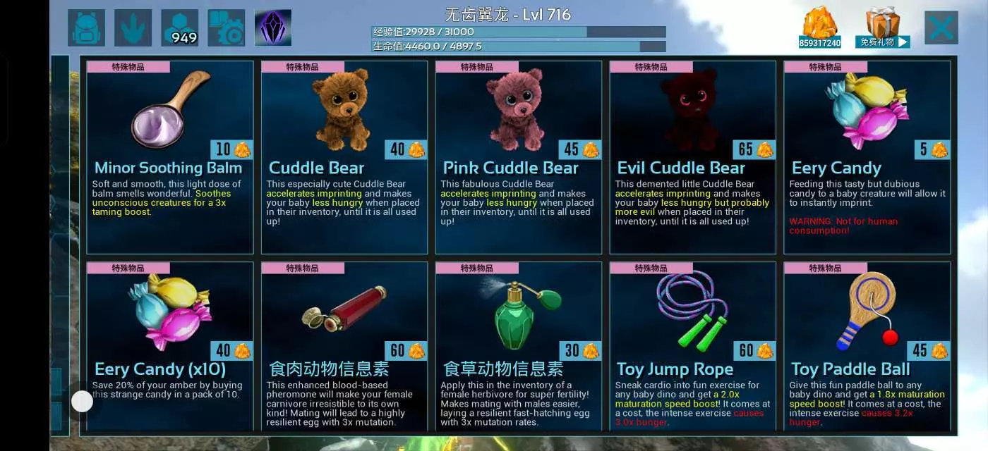 幼崽培育阶段:孵化出来之后靠近幼崽,点击左上角恐龙头图标认养,将对应食物放入幼崽背包中,玩具熊可以减缓幼崽饥饿值消耗(似乎成年也管用,不过前提是玩具熊在幼崽幼年时期绑定并且使用为破损的小熊,并且将其放置于成年龙背包中)跳绳,乒乓球,悠悠球可以加快幼崽成年速度。