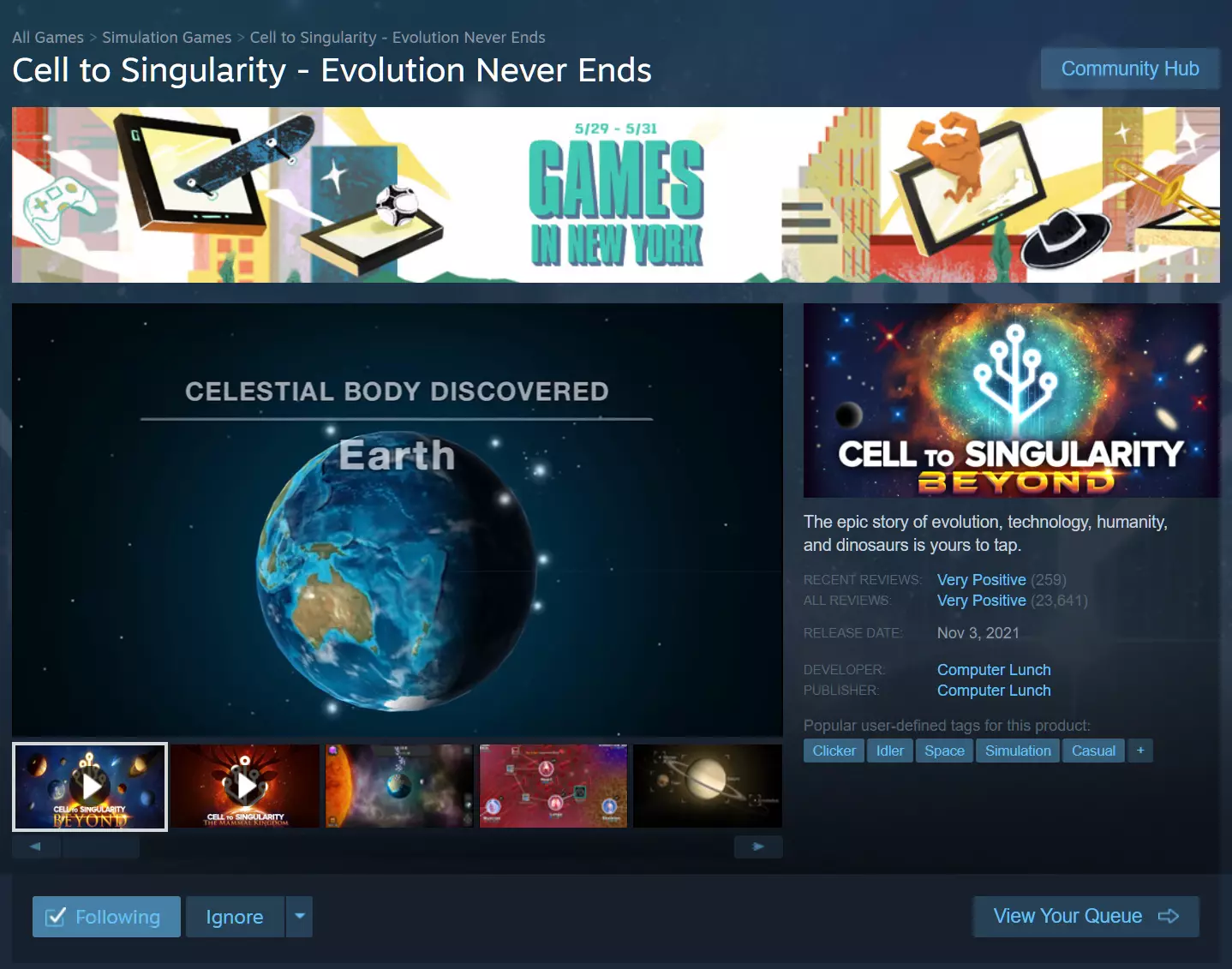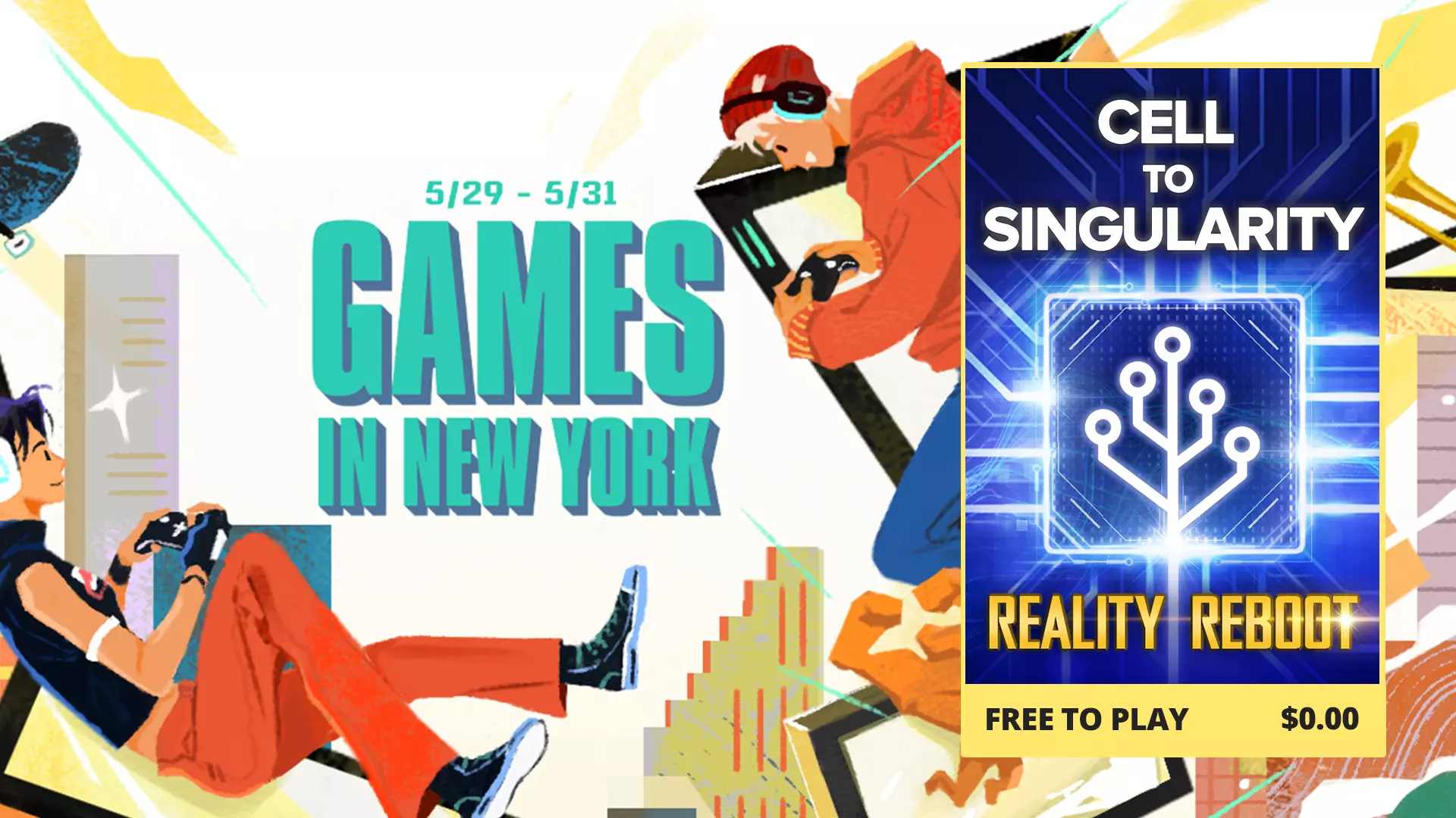 我们非常激动和自豪能够参与“纽约游戏展”。 《细胞到奇点》是纽约市的产物,这早已不是什么秘密。我们是一家位于布鲁克林的小型移动游戏工作室,很荣幸能参与此次展会并代表纽约市。 在PAX展会上,玩家们抢先体验了我们即将推出的扩展内容“Reality Reboot”(目前处于alpha测试阶段)。如果您恰好在纽约地区,我们还将在纽约电子游戏节上现场展示“Reality Reboot”。您可以在这里游玩来自纽约本地开发者的已发布和未发布的新游戏,并为“行政区之战”竞赛加油助威!这将是充满乐趣的一天,有许多适合独自或与朋友、家人一起参与的活动。 “纽约游戏展”Steam促销活动将于5月29日至5月31日举行。这里有众多精彩游戏供您选择,欢迎查看。特别感谢Sia Yang创作的官方封面艺术。