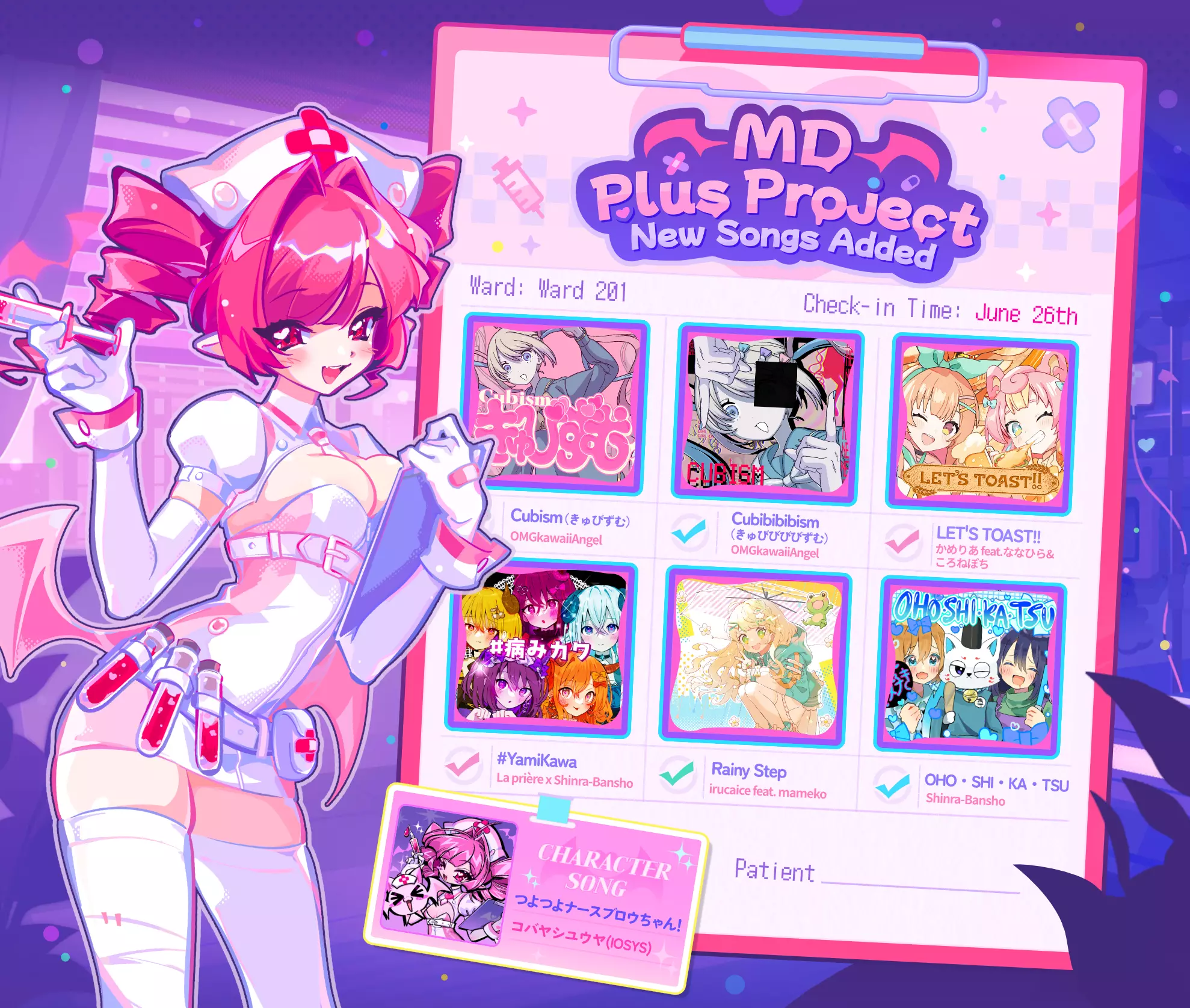 —— 10ml - [MD Plus Project] 专属角色 - ♡「夜曲血嗣布鲁」登场 ♡ —— 20ml - [MD Plus Project] 7首新歌曲 - 3张新插画 - 全新标题画面及主页 —— 30ml - 来自《主播女孩重度依赖》的歌曲 - 「Cubibibibism(きゅびびびびずむ)」*隐藏谱面可用 - 通过双击难度按钮解锁 —— 40ml - 儿童节插画及7周年插画 - 7月6日前登录即可解锁