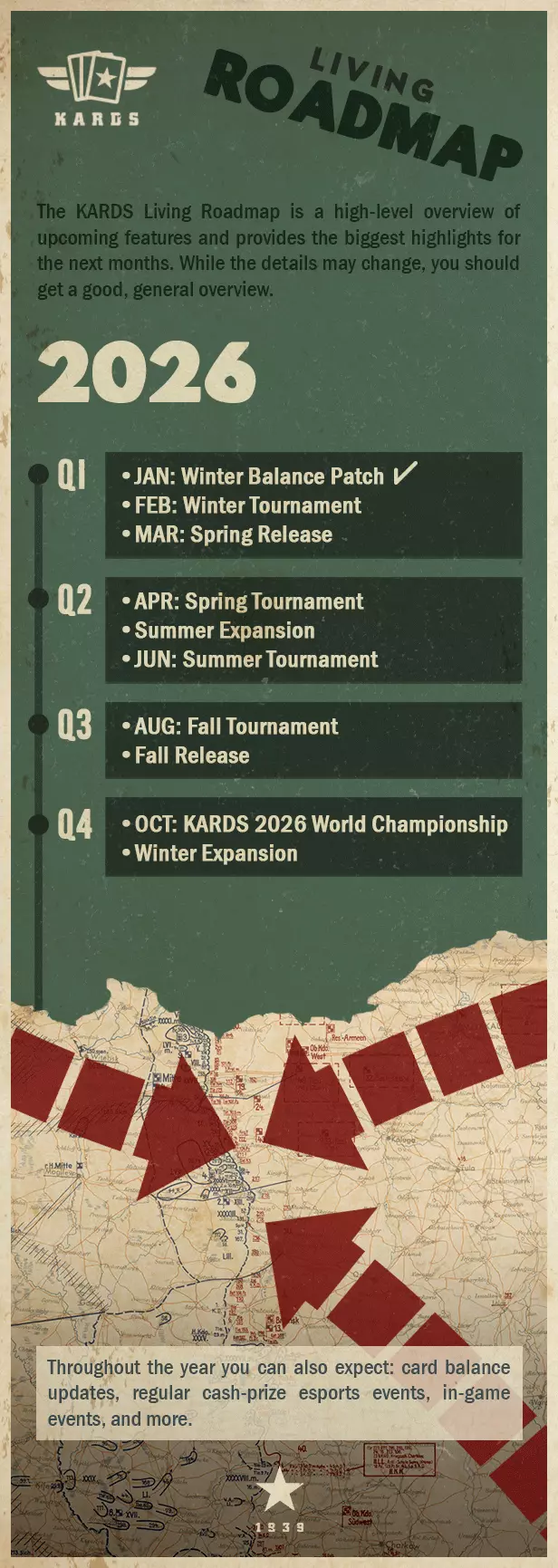 Alongside the milestones shown on the roadmap, you can expect regular card balance updates, adjustments to game modes such as in-game tournaments, Draft, and Classic, UI enhancements, quality-of-life improvements, and other refinements throughout the year. 2026 at a Glance In broad strokes, here’s how the 2026 campaign is shaping up: 2 major expansions - in Summer and Winter 2 major releases - in Spring and Fall 4 seasonal tournaments - Winter, Spring, Summer, and Fall The KARDS 2026 World Championship - in October Ongoing work on various features Plus regular updates and special events along the way The sections below give a bit more detail on these pillars. Major Expansions: Summer & Winter Across 2026, we have four major releases lined up, with the Summer and Winter expansions serving as the card-focused powerhouses of the year. These expansions are planned to bring: A large wave of new cards (on the scale of our biggest previous sets) New mechanics to explore and build around Select feature updates or improvements We’re targeting the Summer expansion for around the middle of the year and the Winter expansion for later in the year. As we get closer, we’ll share more detailed intel on themes, mechanics, and card previews. Major Releases: Spring & Fall Complementing the Summer and Winter expansions, our Spring and Fall releases are equally important moments in the year, centered on new features and improvements to the overall KARDS experience. Where the expansions focus on sheer card volume and new mechanics, these releases are typically where we: Roll out larger feature updates and improvements to game systems Add a more focused set of new cards Make balance changes that keep the battlefield in motion The Spring and Fall releases round out the year with game improvements, new features, and focused mini-sets of cards. With the Spring release scheduled for March, we’re looking forward to sharing more details about this upcoming release with you soon. Esports 2026: Seasonal Tournaments & World Championship In 2026, the KARDS competitive year is planned to be built around: Four seasonal tournaments - Winter, Spring, Summer, and Fall The KARDS 2026 World Championship in October Each seasonal tournament will: Feature top players from the Officer Club ladder and tournament trophy leaderboard from the months leading up to the event Offer a 3,000 USD prize pool Take place in a meta that has recently been refreshed, either by a major release, a major expansion, or a meaningful balance update All roads lead to the KARDS 2026 World Championship, where the most successful competitors from across the year’s circuit will battle for the title of World Champion. You can read more about the esports plans for 2026 here: KARDS ESPORTS 2026 Features in Progress for 2026 Beyond expansions, releases, and tournaments, we’re also working on several larger features and systems. These are in active development, and we’ll share more concrete details as they draw closer. Reserve Pool Rotation When we first introduced the Reserve pool, our goal was to keep the Active card pool at a healthy size, avoid power creep, and make it easier for players to build decks and join the fight. Up until now, rotations have happened four times a year with each major expansion and release, and cards moving into the Reserve pool have been hand-picked rather than tied to specific expansions or sets. In 2026, we’re working on an important evolution of this system. We’re moving toward a once-per-year rotation where cards rotate based on expansions rather than individual hand-picked cards. That means that, instead of selecting specific cards to move into the Reserve pool each time, we’ll rotate by set, creating a clearer and more predictable structure for the Active card pool. This is a significant change to how rotation works in KARDS, and setting it up will involve a period of adjustment as we transition to the new system. We want to take the time to explain all of these changes properly, and will be publishing a dedicated blog that goes into the details of the new rotation model and what it means for your collections. You can expect to hear more about this as we get closer to the Spring release in March, when we plan to start taking the first steps toward this new rotation system. Social Features KARDS has always been about both cards and camaraderie. We’ve seen how much players enjoy playing with friends and building connections across the community. In 2026, we’re working on new ways for players to enjoy KARDS together and to strengthen the social experience overall. We’re not ready to reveal final details yet, but the goal is to make it more fun to share the battlefield with others. Officer Club Ladder As more Commanders rise through the ranks, the Officer Club and the top of the ladder have evolved along with the game. Reaching the OC is still a major achievement, but the sheer number of players getting there each month has shown us that the upper ranks could use an updated structure. We’re planning updates aiming to enhance the Officer Club ladder experience, making continued climbing more meaningful once you reach the OC. These ladder improvements are planned for 2026, and we’ll share more details when we get a bit closer to the update. Skirmishes Introduced in 2022, Skirmishes quickly became a popular limited-time mode with special rules and twists. However, they’ve been on hiatus since early 2025 due to some issues behind the scenes. We’re working to bring Skirmishes back in 2026, with the goal of reintroducing some of your favorite formats and potentially some new ones. KARDS API An official KARDS API has been a long-standing request from some of our most dedicated community members and tool creators. We’re pleased to confirm that an API is in active development and planned for deployment in the first half of 2026. Our aim is to empower community developers to build better websites, tracker