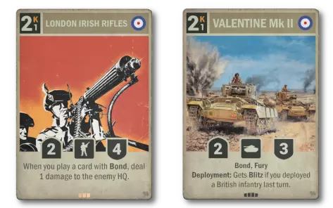 债券连击的一个示例是部署伦敦爱尔兰步枪团,随后部署瓦伦丁Mk II。 伦敦爱尔兰步枪团在你打出带有债券(Bond)的卡牌时,会对敌方指挥部造成1点伤害。瓦伦丁Mk II不仅带有债券(Bond)属性,能触发该效果,还会在你上一回合打出过英国步兵的情况下,于部署时获得闪电战(Blitz)。再加上其狂怒(Fury)能力可使其攻击两次,这对组合能造成可观的伤害。