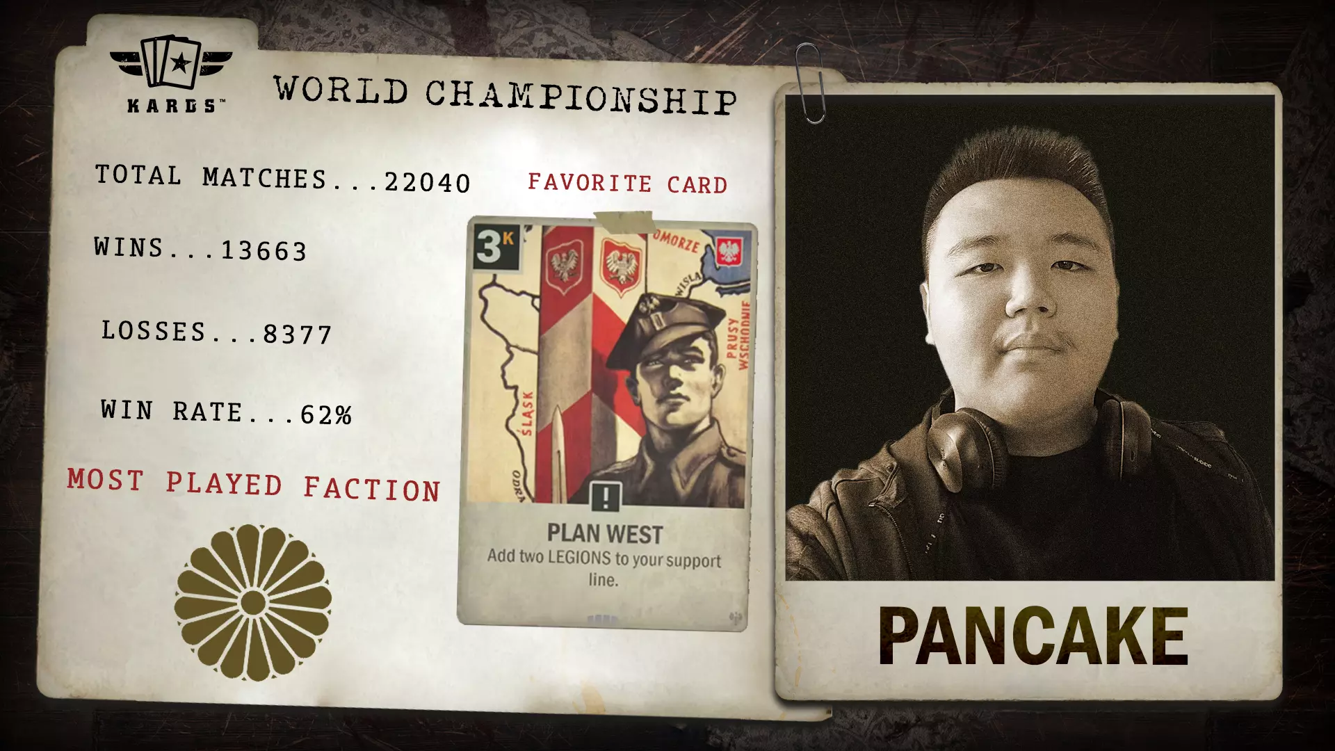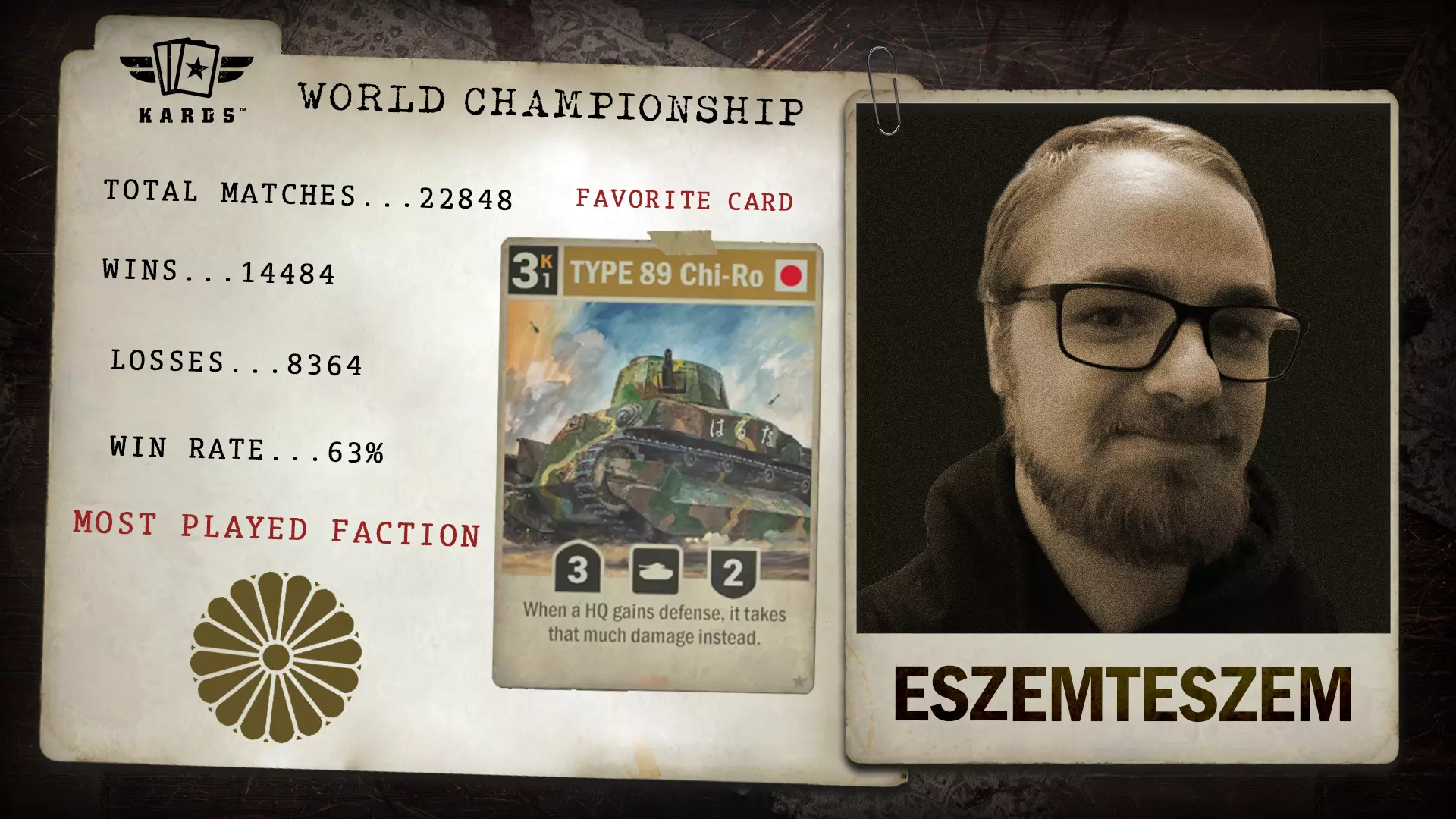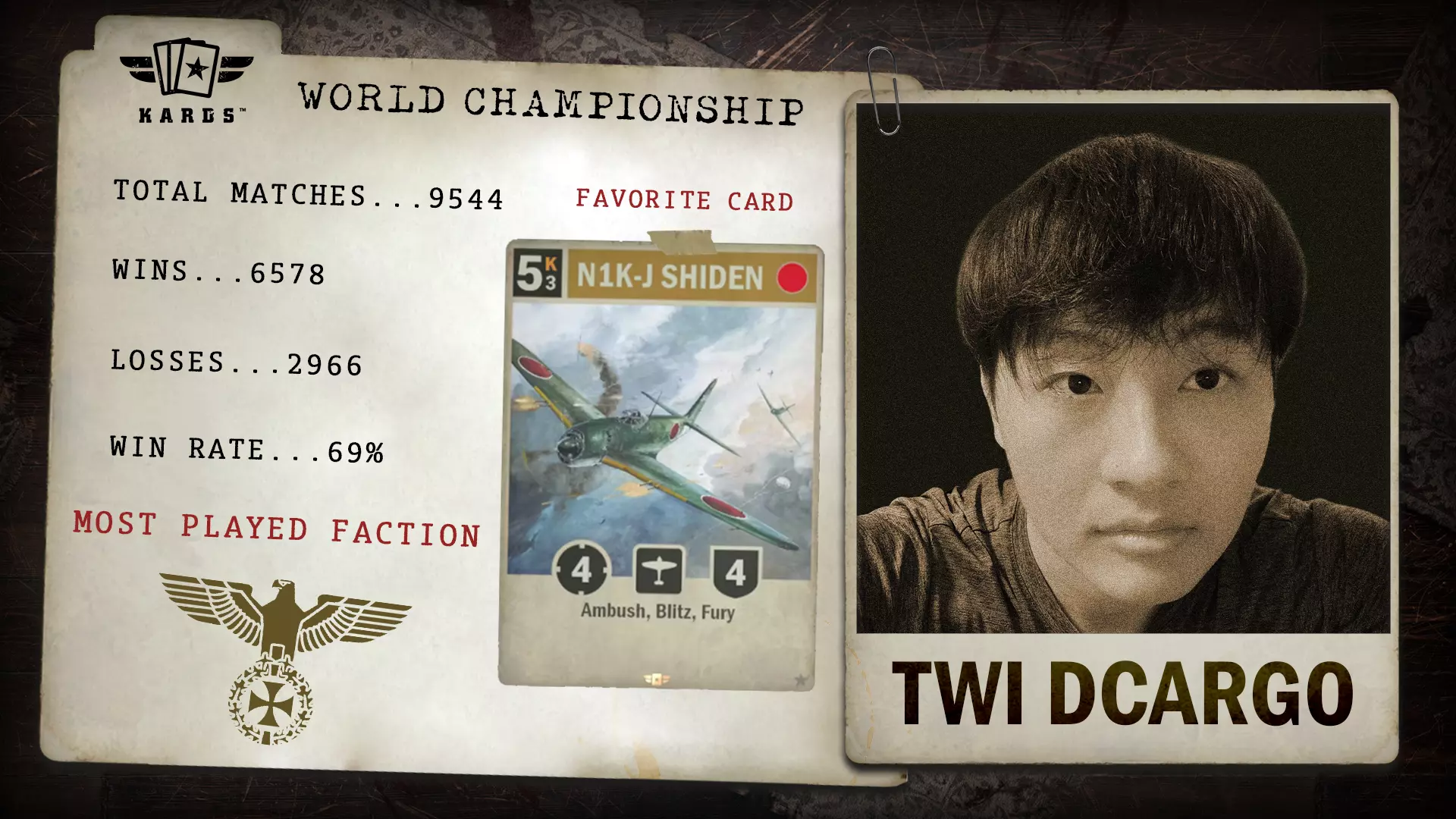 Twi Dcargo于2024年年中加入《KARDS》,在竞技领域崭露头角。其在近万场比赛中取得了68.9%的胜率,凭借稳定的成绩和快速的排名攀升,成功获得了世界锦标赛的参赛资格。 胜/负场:6,578 / 2,966 胜率:68.9% 最常使用国家:德国 最少使用国家:美国 总比赛场次:9,544 开始游玩时间:2024年8月 晋级方式:联合阵线锦标赛 Eszemteszem - 联合阵线扩展锦标赛