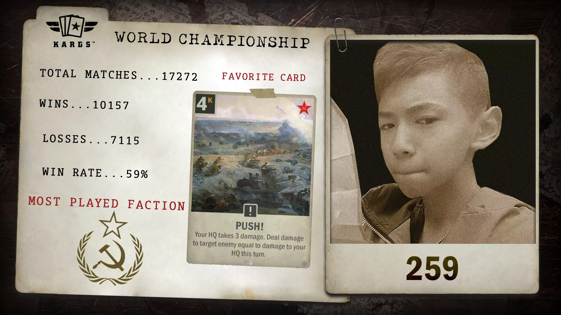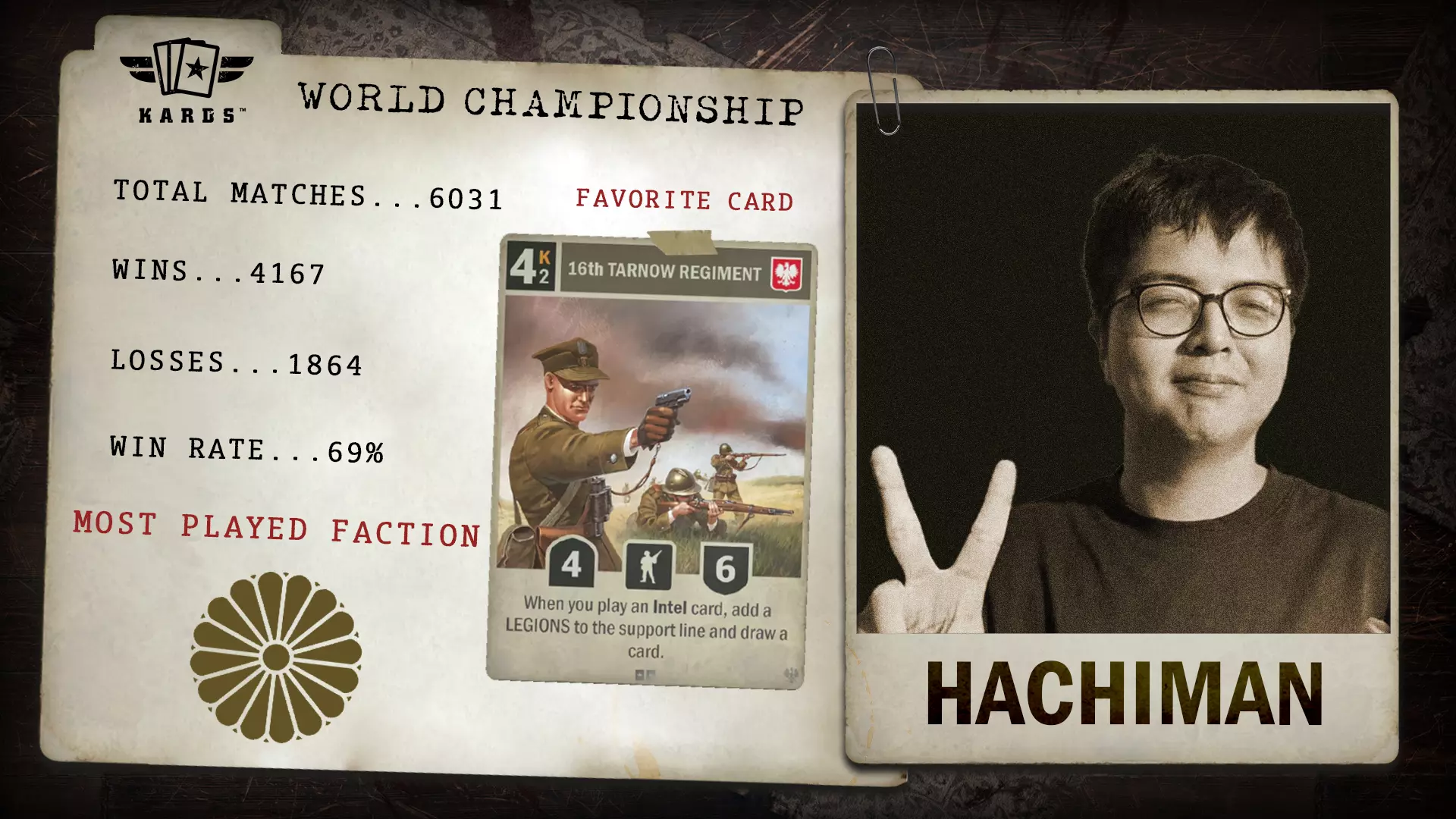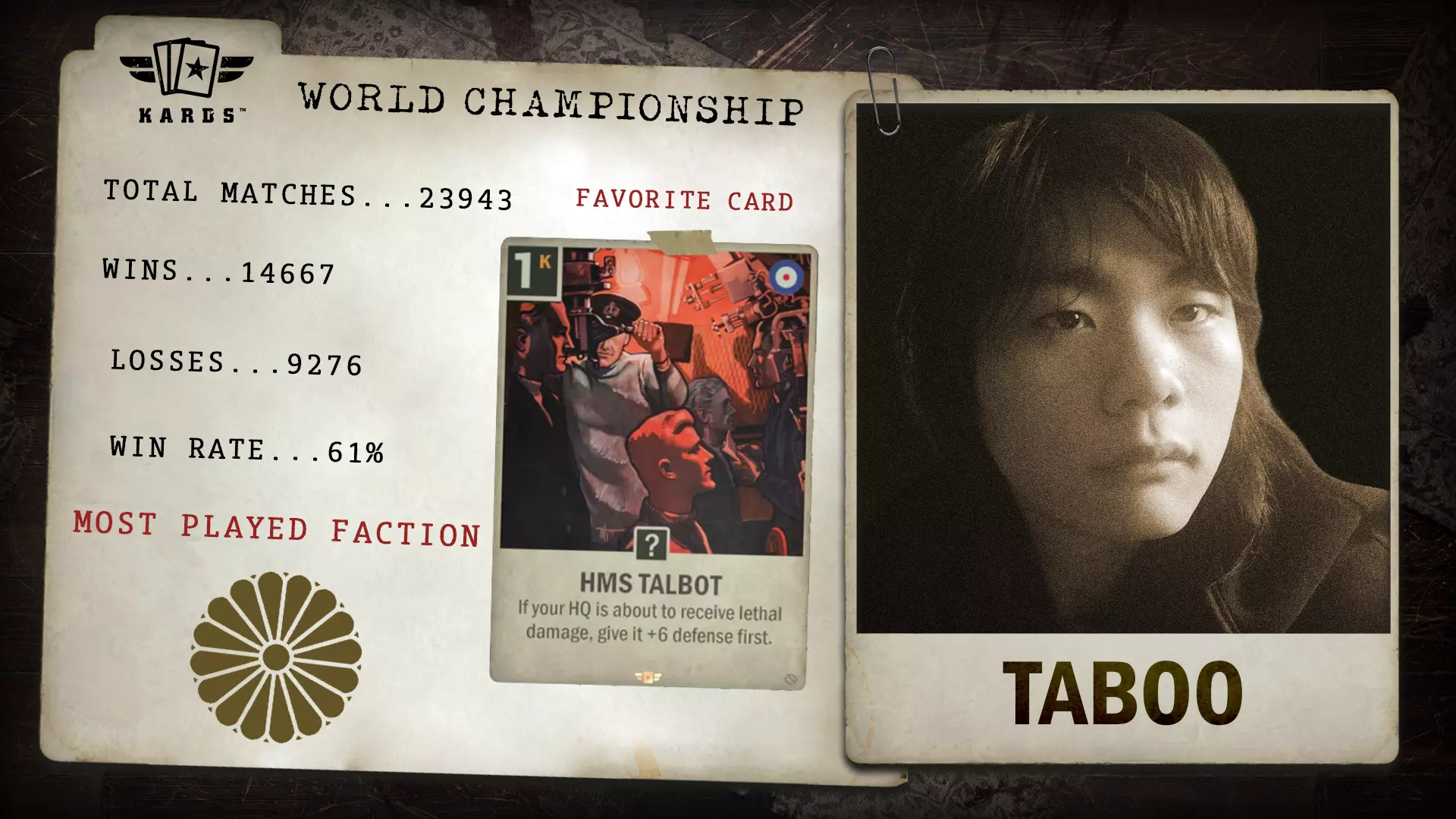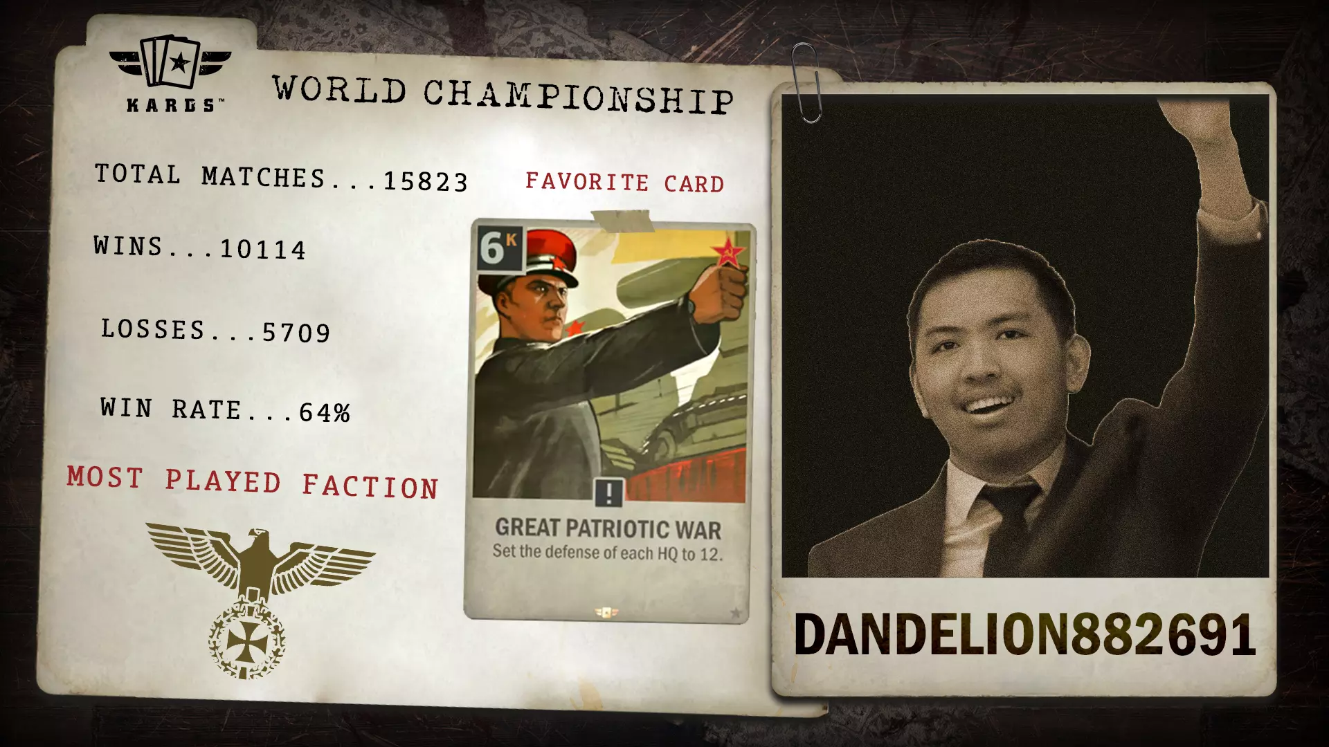 Twi Dcargo于2024年年中加入《KARDS》,在竞技领域崭露头角。其在近万场比赛中取得了68.9%的胜率,凭借稳定的成绩和快速的排名攀升,成功获得了世界锦标赛的参赛资格。 胜/负场:6,578 / 2,966 胜率:68.9% 最常使用国家:德国 最少使用国家:美国 总比赛场次:9,544 开始游玩时间:2024年8月 晋级方式:联合阵线锦标赛 Eszemteszem - 联合阵线扩展锦标赛
