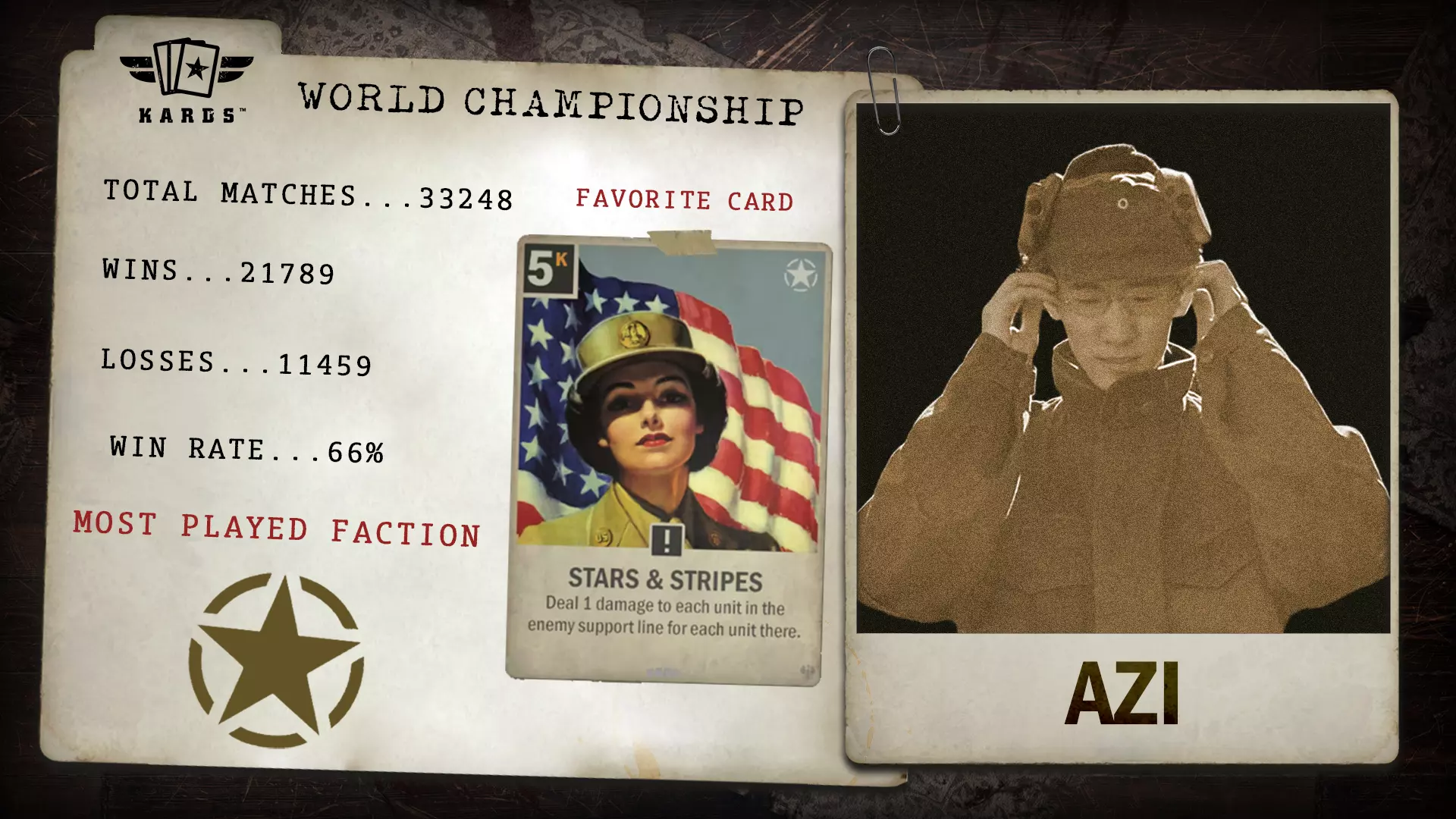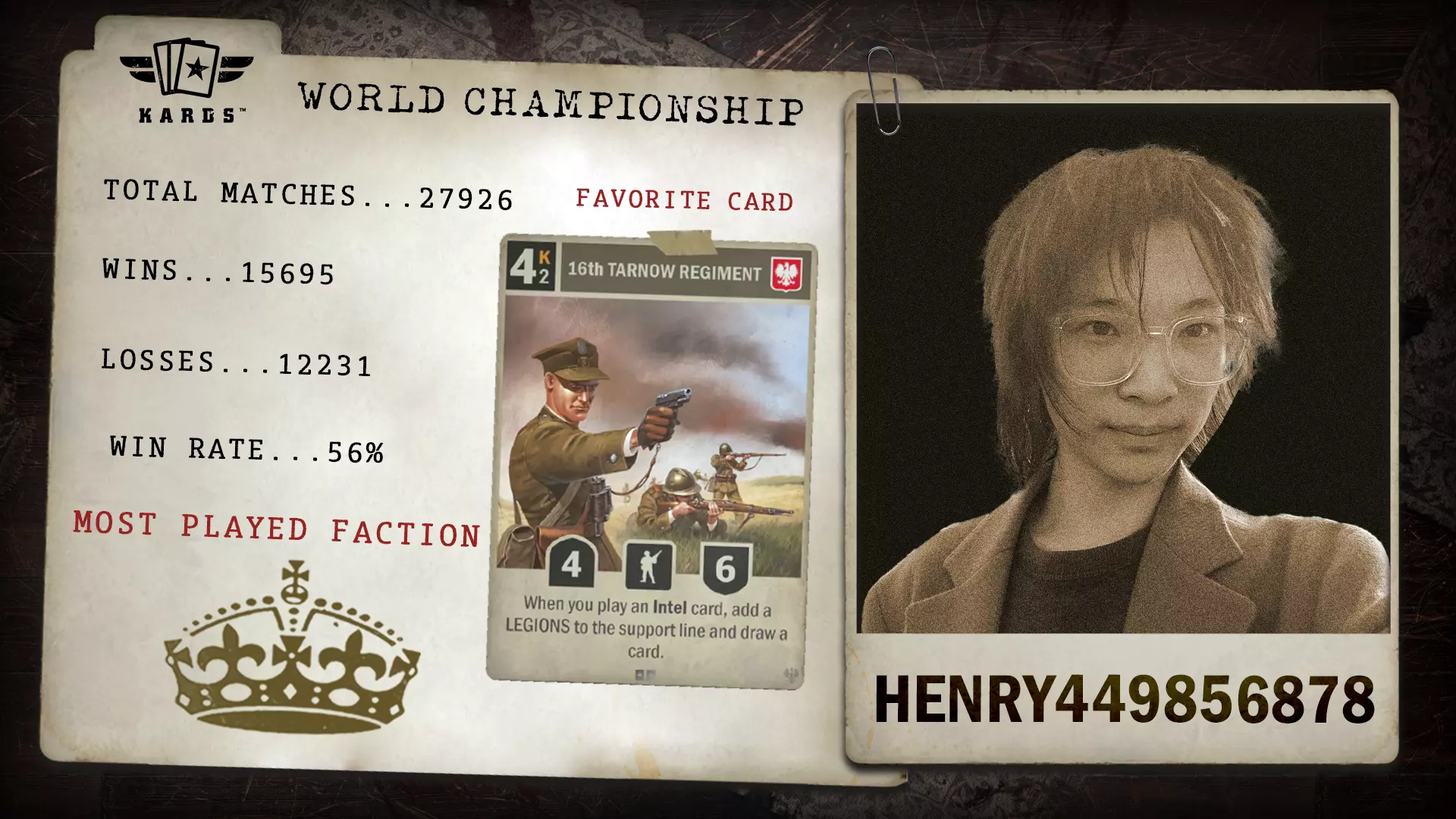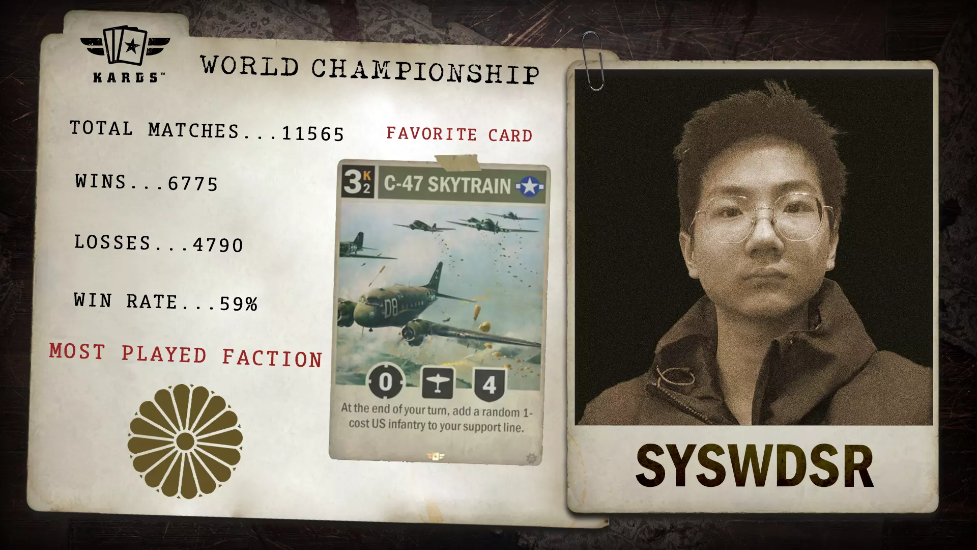 自2019年以来,eszemteszem已进行了超过22,000场对战,是《KARDS》中经验最丰富的指挥官之一。凭借63.4%的胜率以及多年来稳定的表现,他们为世界锦标赛带来了资深的稳定性和悠久的竞技历史。 胜/负:14,484 / 8,364 胜率:63.4% 最常使用国家:日本 最少使用国家:苏联 总对战数:22,848 开始游玩时间:2019年1月 晋级途径:联合阵线锦标赛 Syswdsr - 海战扩展锦标赛