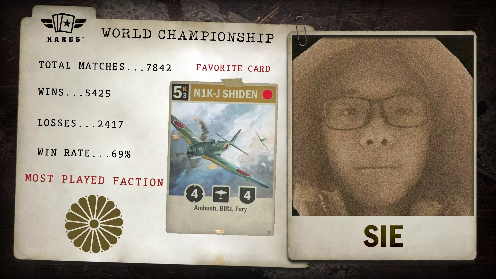 Sie_于2024年初加入《KARDS》战场,在海战锦标赛中迅速展现实力,获得第三名。其胜率高达69.2%,是今年决赛中胜率最高的选手之一,代表了迅速崭露头角的新一代指挥官。 胜/负场:5,425 / 2,417 胜率:69.2% 最常使用国家:日本 最少使用国家:英国 总对战场次:7,842 开始游玩时间:2024年2月 晋级途径:海战锦标赛 失其本心八幡(HachimanLostHeart)- 制空权扩展锦标赛