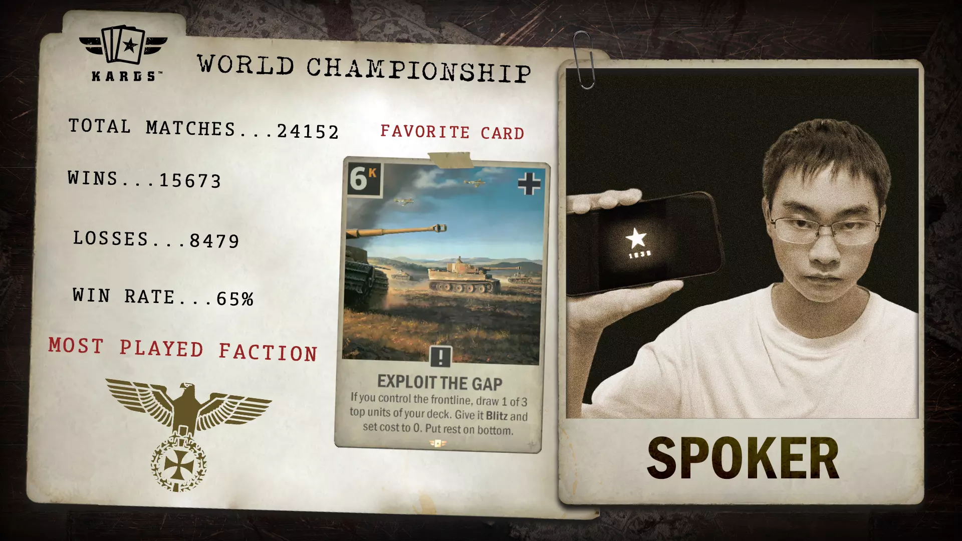 指挥官们, 舞台已搭建完毕。经过数月锦标赛的实战考验,十六位指挥官脱颖而出,跻身顶尖行列。 12月20日至21日,这些指挥官将携其最犀利的卡组、最大胆的策略以及坚定不移的决心,征战《KARDS》2025世界锦标赛——本年度竞技征程的最终对决。 前方是对指挥能力的终极考验。究竟是哪十六位精英将为12,000美元的奖金池以及《KARDS》2025世界冠军的头衔展开角逐? 阅读下文了解所有详情! Spoker - 《KARDS》2024世界冠军