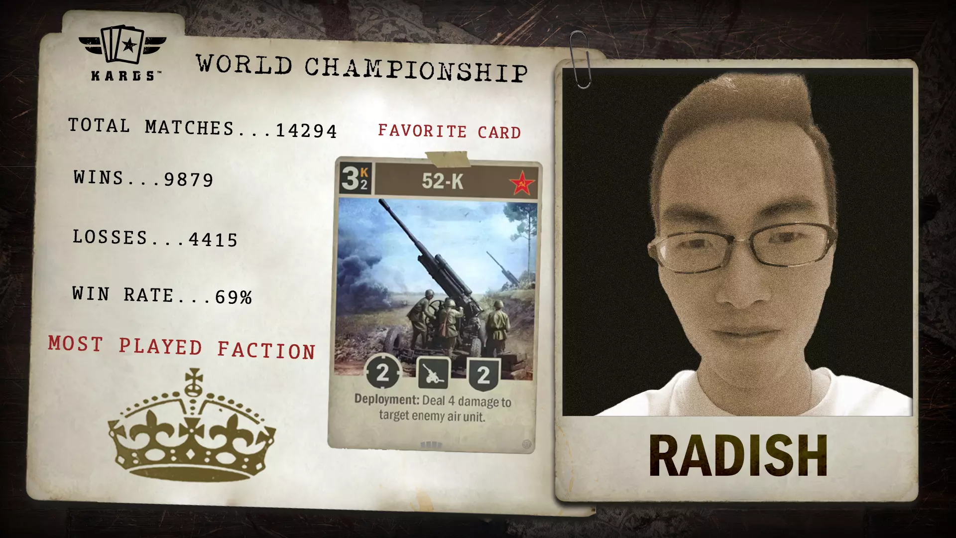 通过“铁血”扩展包锦标赛获得资格的煎饼1(Pancake),以超过22,000场的惊人比赛经验晋级世界锦标赛。他们稳定的表现和长期的投入使其成为赛场上经验最丰富的指挥官之一。 胜负场次:13,663 / 8,377 胜率:62.0% 最常使用国家:日本 最少使用国家:英国 总比赛场次:22,040 开始游戏时间:2021年12月 晋级途径:Blood & Iron Tournament 作死的骡博(Radish)- 统一战线扩展包锦标赛