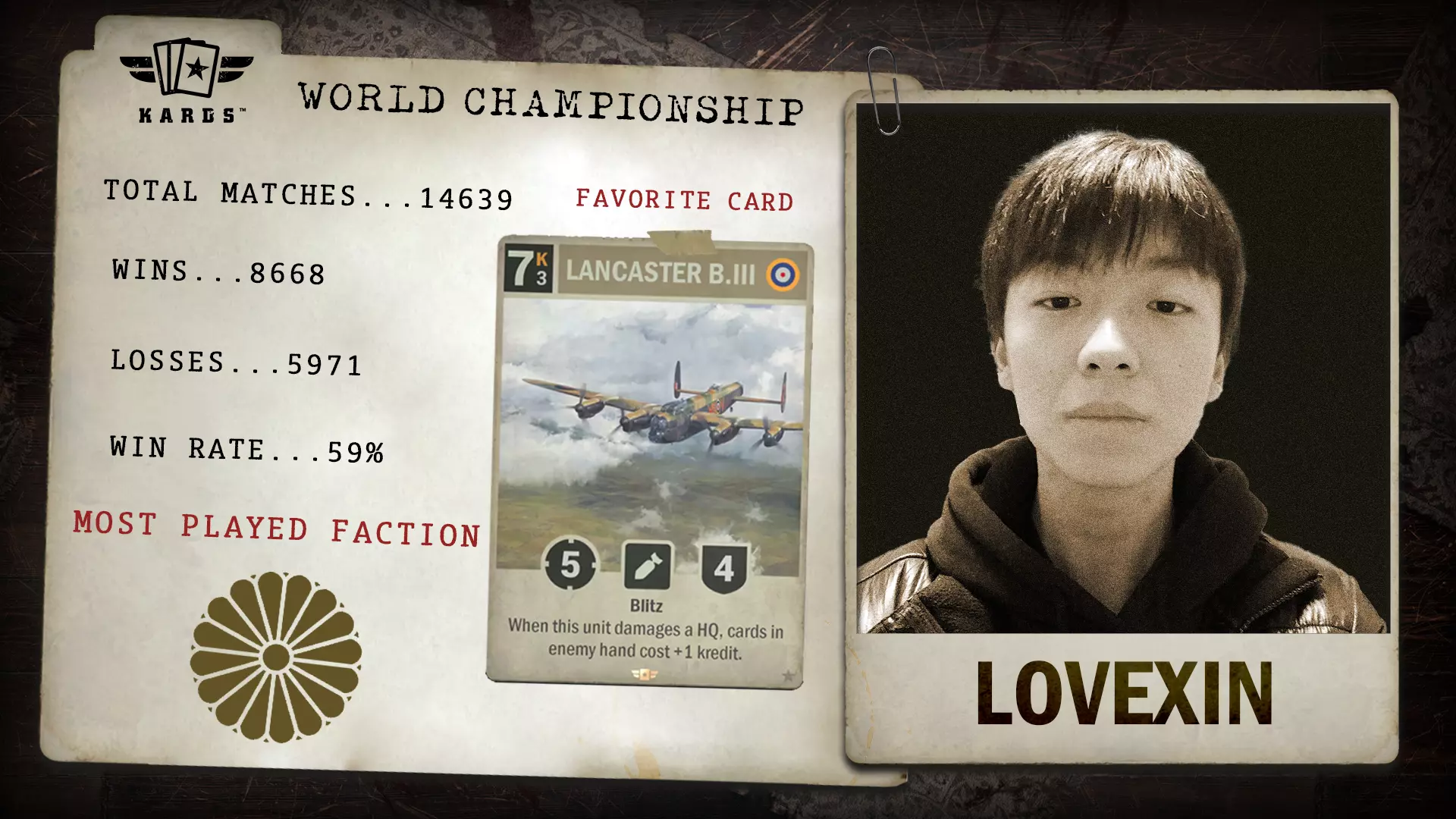 爱欣欣欣欣(Lovexin)以8668场胜利、59.2%胜率的稳定战绩闯入决赛,其参赛场次已超过14000场。自2023年9月开启《KARDS》征程以来,爱欣欣欣欣在排位赛与锦标赛中展现出稳定的竞技状态和稳步的进步。 胜/负场:8668 / 5971 胜率:59.2% 游玩最多国家:日本 游玩最少国家:苏联 总场次:14639 开始游玩时间:2023年9月 晋级途径:制空权锦标赛 决战舞台已搭建完毕 最后的冲刺已然到来。历经一整年的征战与激烈角逐,如今仅剩16位指挥官,他们将在最后一场战略与技巧的较量中证明自己的实力。 《KARDS》2025年世界锦标赛将于12月20日至21日举行。锁定Twitch直播,见证每一步关键决策、每一次极限操作,以及每一个铸就冠军的瞬间。 舞台已搭建完毕,牌组已准备就绪,最终对决一触即发。谁将成为《KARDS》2025年世界冠军?