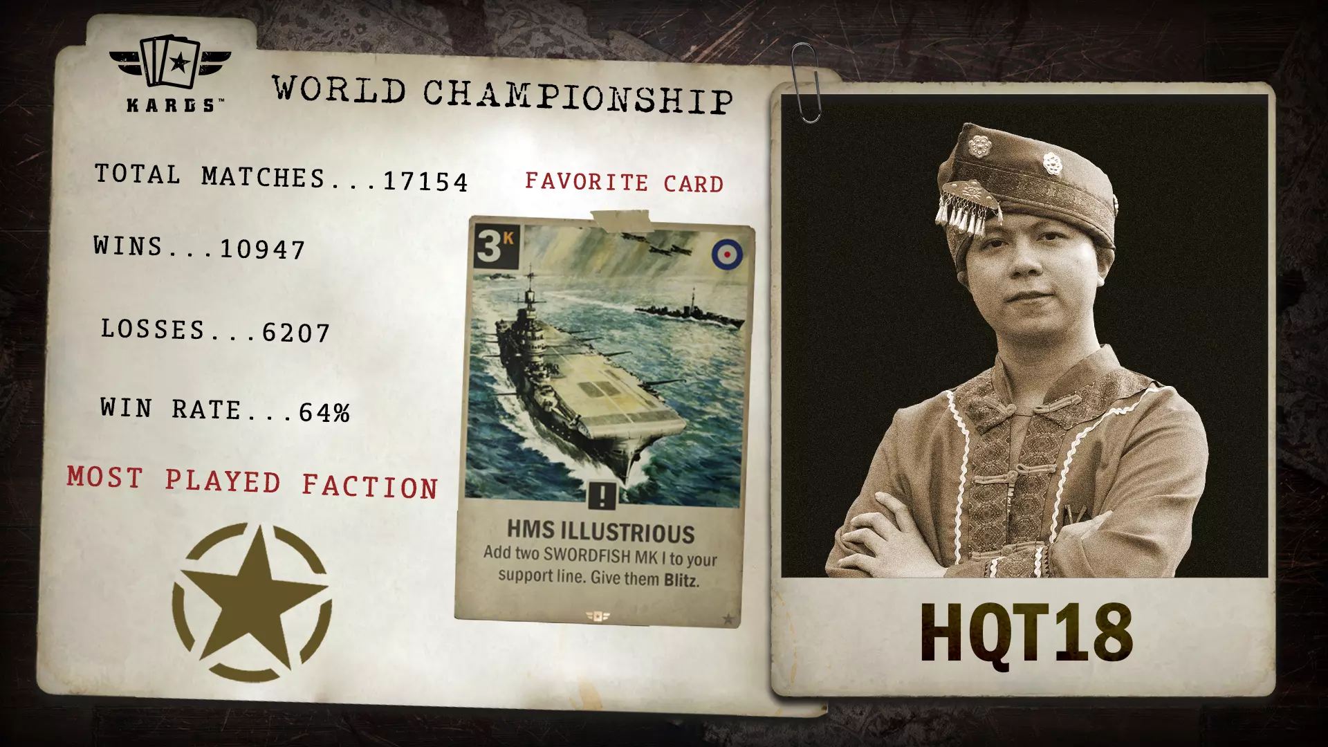 hqt18通过“铁血”扩展锦标赛获得参赛资格,展现出了顶尖指挥官应有的稳定表现。其参赛场次超17,000场,胜率63.8%,为世界锦标赛舞台带来了丰富的实战经验。 胜/负场:10,947 / 6,207 胜率:63.8% 最常使用国家:美国 最少使用国家:苏联 总场次:17,154 开始游玩时间:2022年12月 晋级方式:“铁血”锦标赛 259 - “铁血”扩展锦标赛
