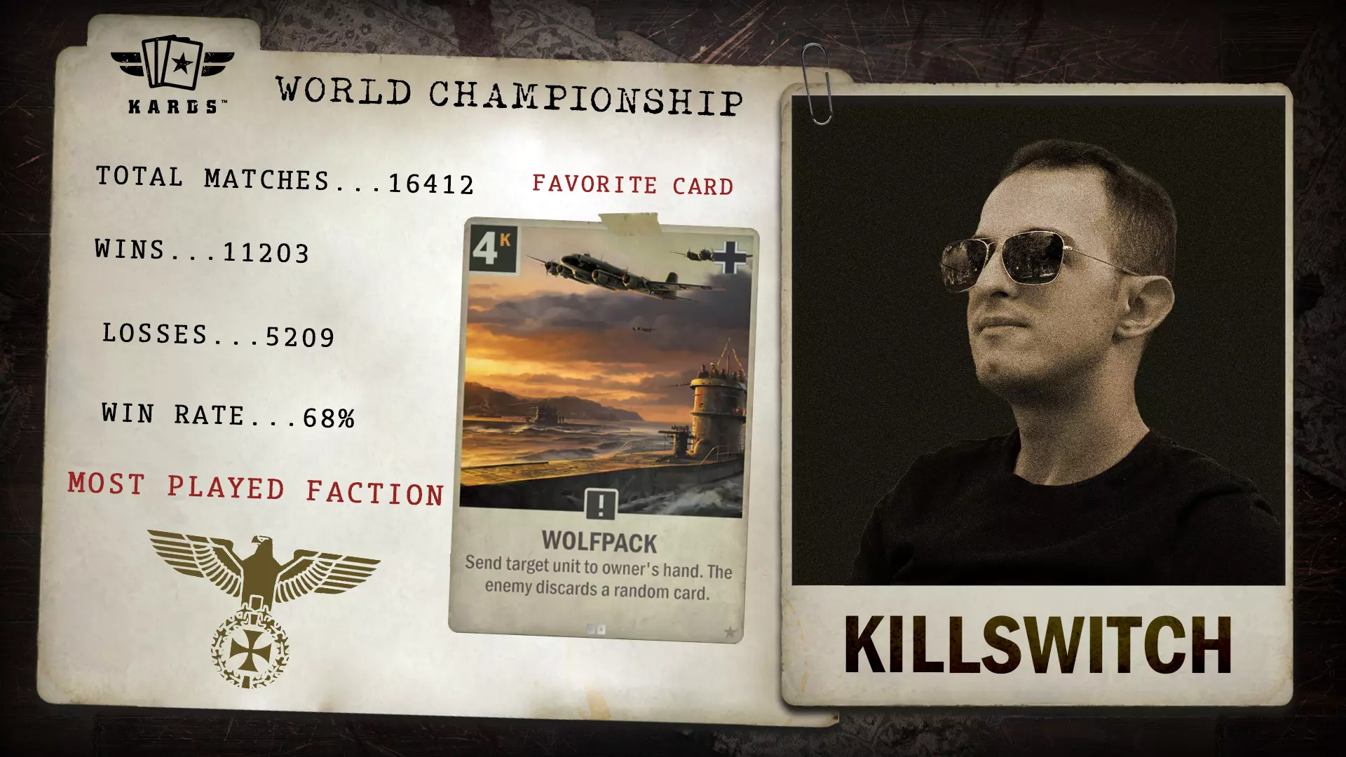 作为今年参赛选手中经验最丰富的选手之一,“变成光守护阿梓公主(Azi)”自2019年《KARDS》尚未正式在Steam平台发布时便已加入游戏,至今已进行了超过33,000场对战。凭借65.5%的胜率,他将为世界锦标赛舞台带来资深的经验与稳定的出色表现。 胜/负场数:21,789 / 11,459 胜率:65.5% 最常使用国家:美国 最少使用国家:英国 总对战场次:33,248 开始游戏时间:2019年12月 晋级方式:2024年世界锦标赛 Killswitch - KARDS 2024 World Championship