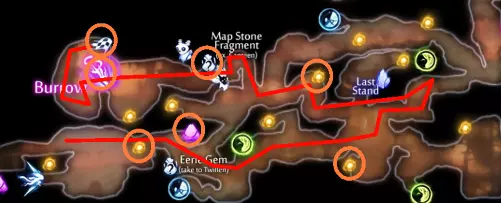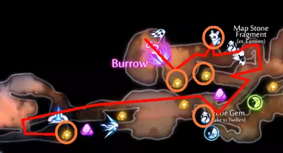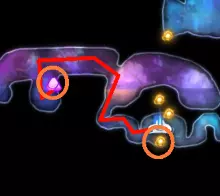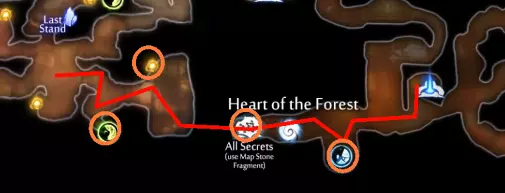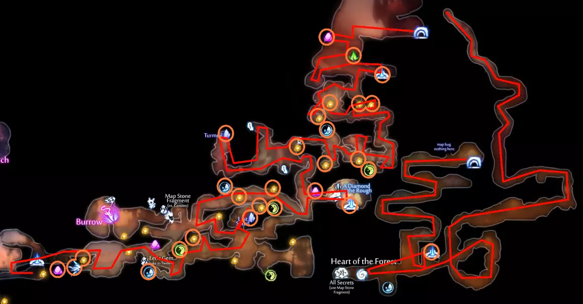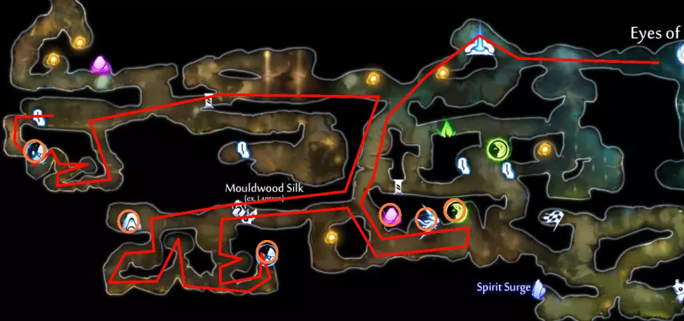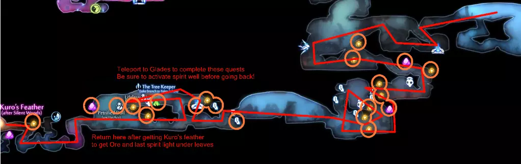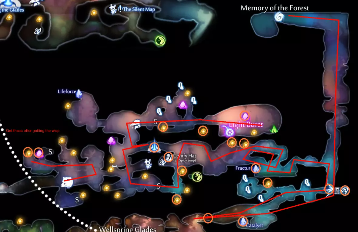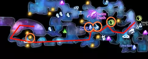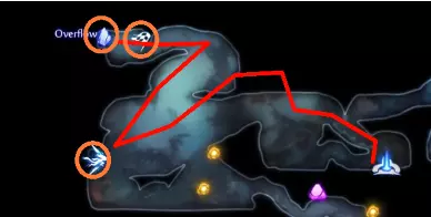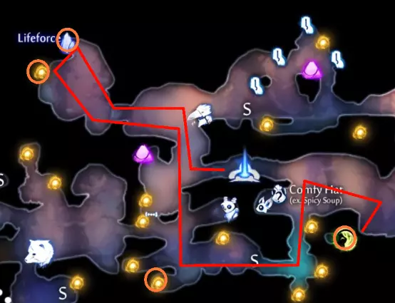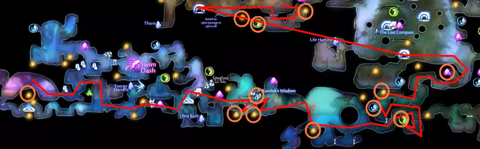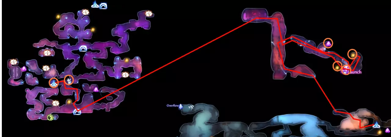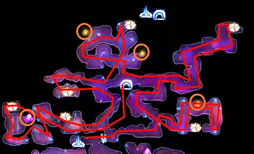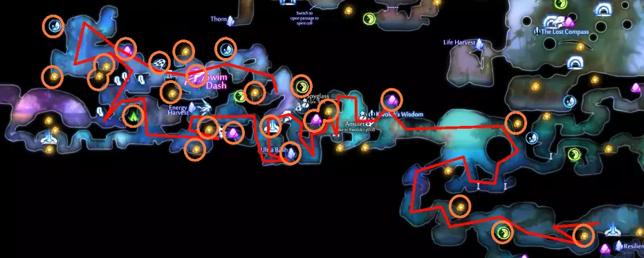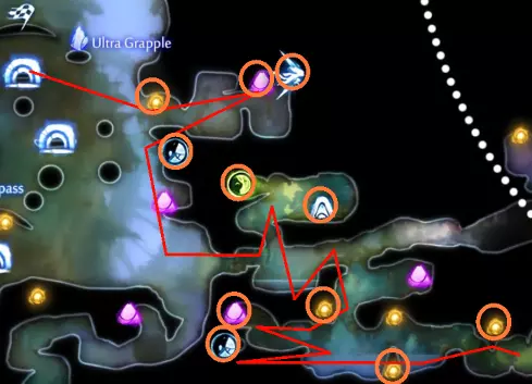 关于水上冲刺的说明 如果你使用键盘和鼠标(KB&M),可能会觉得只能向8个方向冲刺。但事实并非如此!奥日(Ori)在按下方向键时不会立即转向,而是会在原地快速旋转。如果你在奥日旋转时进行冲刺,无论你按的是哪个方向键,奥日都会朝着当前面向的方向冲刺。你可以利用这一点,在冲刺前“转向”不同的方向,从而发挥优势。 例如,当从水中上浮时,你可以在向上冲刺前向左或向右转向,这样奥日就会以小角度跳出水面,而不是垂直向上。 此外,奥日可以像冲出水面一样轻松地冲进水中。这与掘地(Burrow)的操作方式相同。在水面附近与敌人战斗时,请记住这一点。关于爆炸蛞蝓的说明:卢马池塘中的爆炸史莱姆在受到攻击后会定时引爆。攻击它们一次后,需退后等待。 技巧与窍门: - 获取第一块戈雷克矿石的技巧是远离气泡。你的羽毛受到的风力会较小,从而以较小的力度推动气泡。 - 第二块戈雷克矿石可能有些棘手。你必须在不与气泡碰撞的情况下进行钩爪操作。在接触气泡前尽量长时间停留在空中,以获得最大高度。 - 这是卢马池塘中最危险的区域。你需要触发顶部的粉碎机关,这样就不会在它落下后浪费时间向上游。然后,在抓取光源时你需要保持稍低的位置,以免被天花板上的物体卡住。如果你能成功做到,这可是个巧妙的技巧。这些东西如果放任不管会很麻烦,毕竟它们会爆炸。如果你能在把它们推回水里后重新利用,或者把它们远远砸开,之后就不用担心它们会和你一起在水里游来游去了。 记住,你可以冲刺进入水中。在争取最终计时时,这是获得额外速度的好方法。 使用上面提到的水上冲刺技巧,即使使用键盘鼠标也能拿到这个灵火。只需在冲刺前一瞬间按下“右”键。 **腐木深渊** **路径**