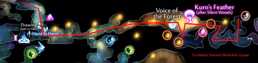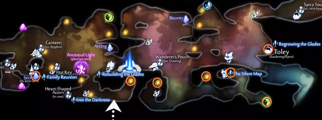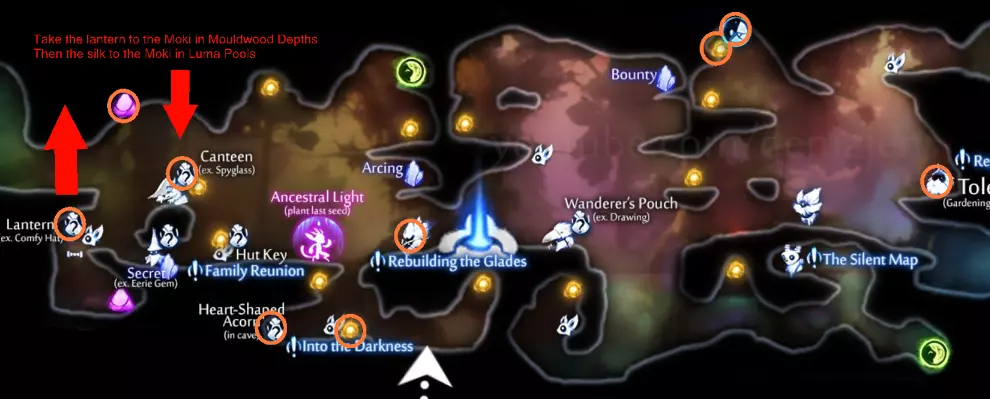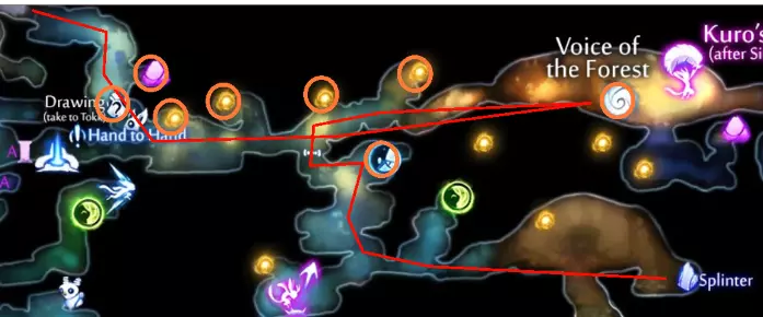 小贴士与技巧 这里没太多需要说明的。在水下时注意你的水表,骑库(Ku)飞行时留意尖刺,进行气泡弹跳时不要操之过急。除此之外,寂静森林是危险性较低的区域之一。 同时建议你借此机会获取琪(Kii)的种子带来的25%额外伤害加成。这在对付 wisps 时会有奇效。 卢马池塘 路径