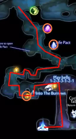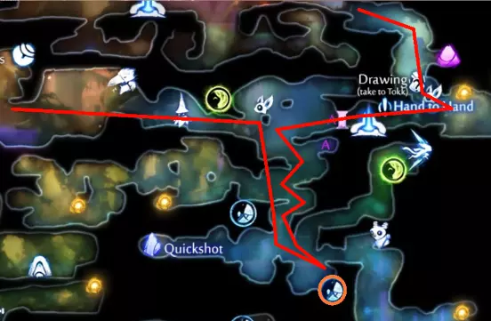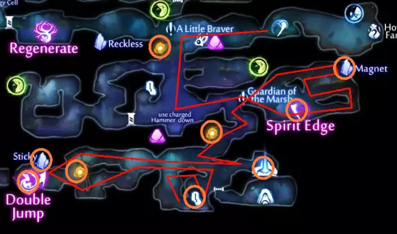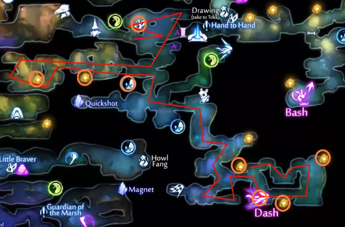 ### 技巧与提示 这些蝙蝠可能会持续骚扰,关于如何应对它们,我在《莫尔德伍德深处》(Mouldwood Depths)区域提供了完整策略,那里是它们数量最多的地方。不过目前,你需要让这只蝙蝠保持存活,以便借助它进行弹跳。 ### 危险区域 在《墨水沼泽》(Inkwater Marsh)中,奥弗(Opher)卖给你第一把武器的地方,在返回时**极度危险**。这里有两只歌唱飞虫(Singer Flys)、一只蚊子(Skeeter),以及最危险的——一只红鲷鱼(Red Snapper),它会蜷缩成球并在你被其他敌人分心时向你冲锋。最好传送到游戏开始时的灵魂井(spirit well),而不是步行返回。 ### 寂静森林(Silent Woods) 路径
